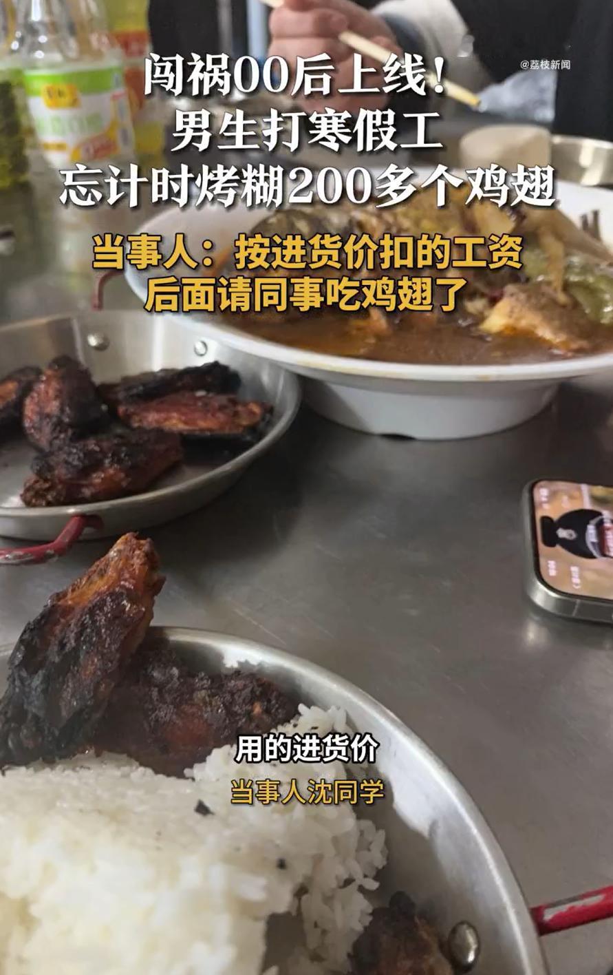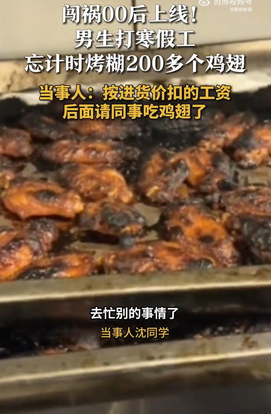 第一批闯祸的人回家了!山东济南,一男生寒假去打工,结果钱还没赚到就先搭了进去,在烤鸡翅时忘记了时间,导致200多个鸡翅全都烤糊了,拿出来时觉得天都塌了,而这些鸡翅,自然是由他的工资来买单 寒假开始后,不少学生想挣点零花钱,也积累些经验。沈同学就是其中之一。他找了份餐饮店的临时工,想着既能锻炼自己,又能赚些收入,没想到活儿还没干多久,就先闯了个祸 那天店里比较忙,他把一批鸡翅放进烤箱,本该定时查看,结果一转身忙别的事,把计时给忘了。等再想起来,跑过去打开烤箱一看,整个人都懵了,两百多个鸡翅全烤糊了,黑乎乎一片,根本没法卖了 店里的老板按照进货成本,从沈同学的工资里扣了钱。下班之后,沈同学心情挺复杂,但还是把烤糊的鸡翅稍微处理了一下,请同事一起分着吃了。用他的话说,虽然糊了,但扔了可惜,就当请大家加个餐吧 其实类似的情况,很多打过寒假工的学生都经历过。第一次接触实际工作,手忙脚乱、顾此失彼是常事。有人端盘子打翻过菜,有人收银算错过账,有人在仓库点错货……看似小事,但对初入社会的年轻人来说,可能是一次不小的冲击 当然换个角度看,这也是一个经验的累积,在学校里,犯错可能只是扣分、写检查;在职场上,失误往往直接关联到经济损失和他人的工作。这种真实的代价,比任何说教都更让人记住