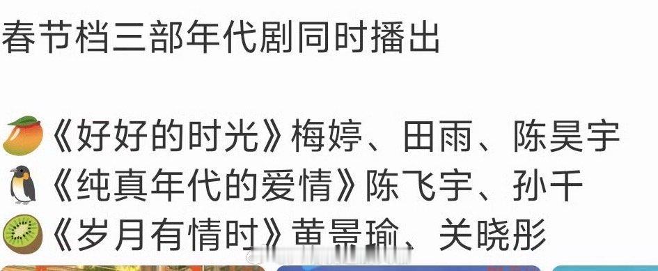 三部年代剧春节档对打就是说这下观众们有福了啊!陈飞宇、孙千《纯真年代的爱情》、黄景瑜关晓彤《岁月有情时》、梅婷陈昊宇《好好的时光》都会在春节档期间开播,年代剧题材这次是真的要支棱起来了叭!三部年代剧春节档同期开播
