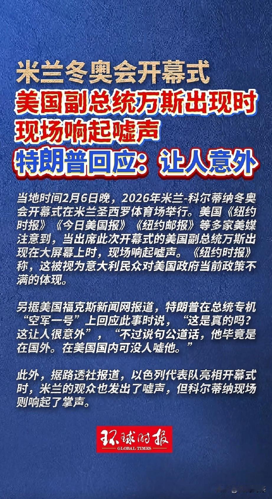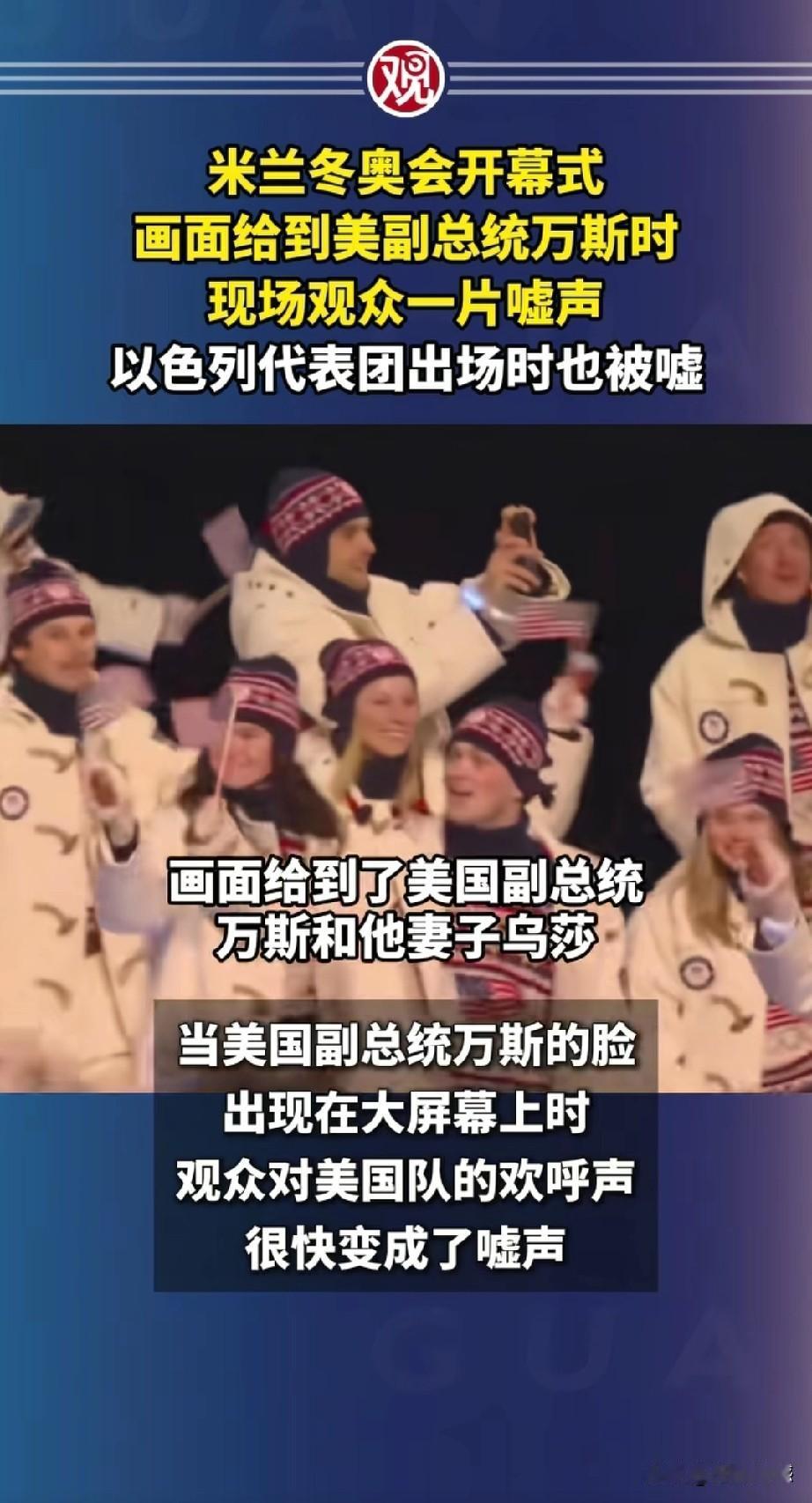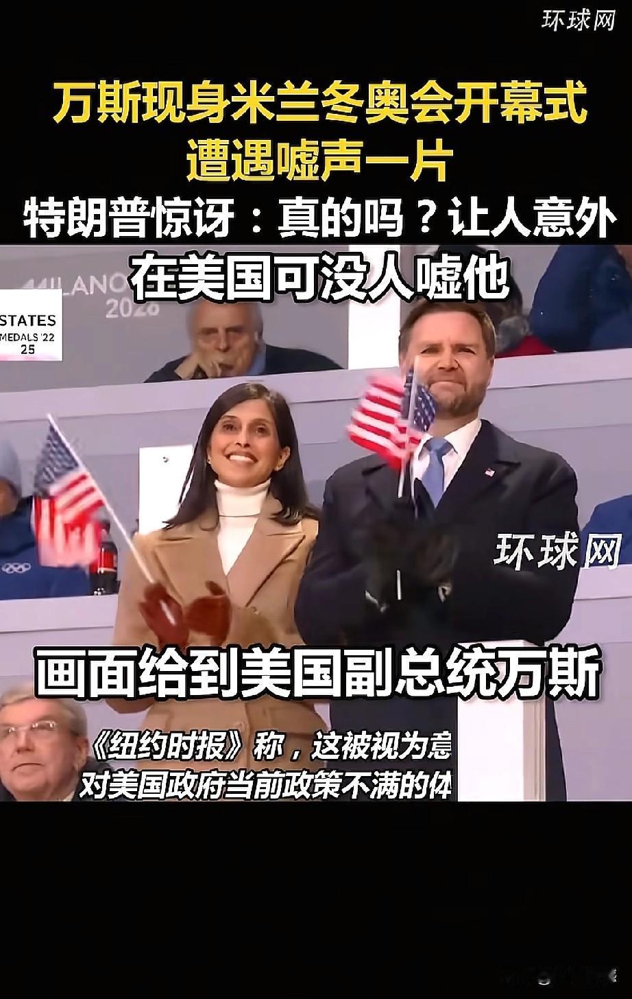 万斯2月6日出现在米兰冬奥会现场,当大屏幕显示他的头像时,现场观众一片嘘声,这真是够尴尬的了,现场观众如此对待万斯,这让万斯情何以堪?老特在回应此事时,说的也非常有意思,老特说:“这是真的吗? 让人很意外,不过说句公道话,他毕竟是在国外。在美国国内可没人嘘他。”这件事发生在意大利米兰,万斯会不会对梅洛尼有意见呢?肯定是不会的,他的格局不可能那么小!