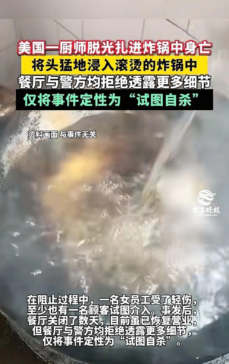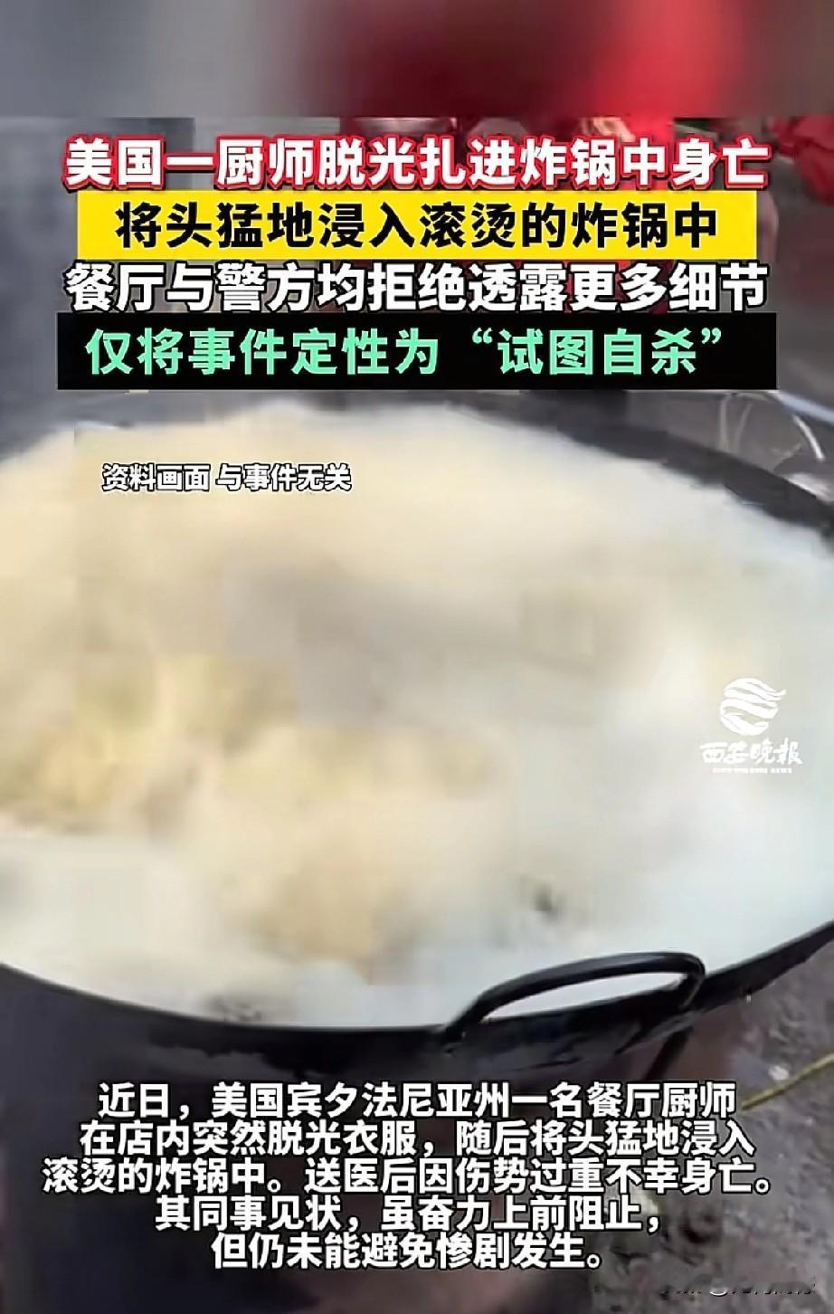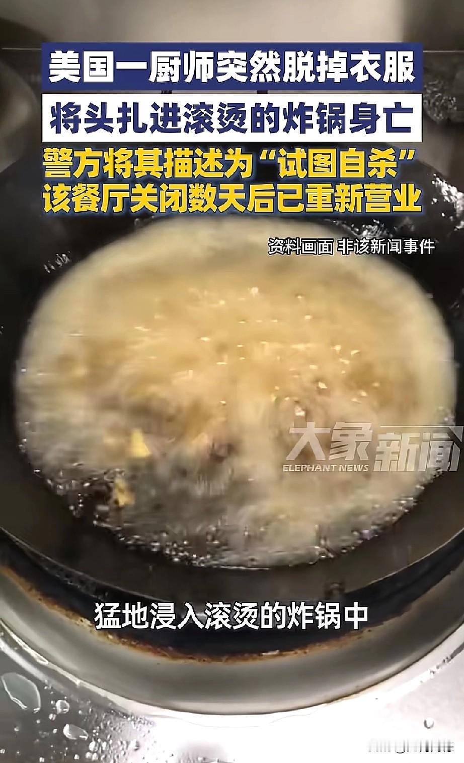 大漂亮世界,无奇不有,近日美国宾夕法尼亚一个餐馆的一名厨师,突然脱光了衣服,把自己的头扎进了滚烫的油锅里,由于受伤严重,最后抢救无效死亡。看到这个消息之后,感觉特别的惊讶,这个厨师为什么要选择以这样的方式结束自己的生命?也许这个人脑袋是有问题了,在大漂亮这里,脑袋有问题的人也特别多,奇葩的事也特别多,层出不穷,令人咋舌!