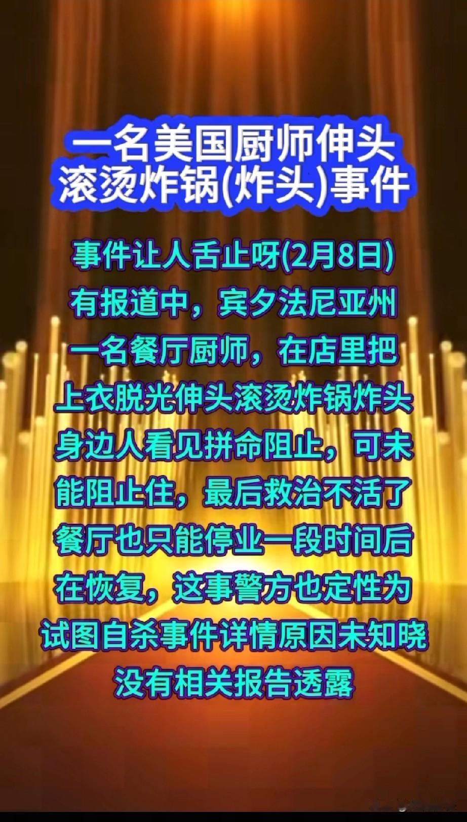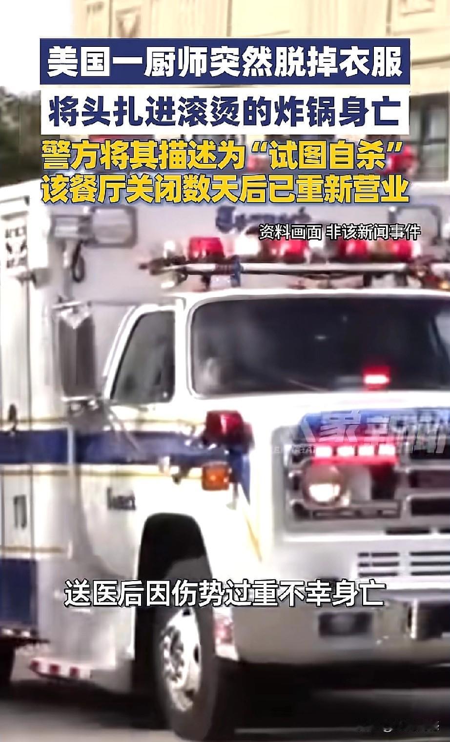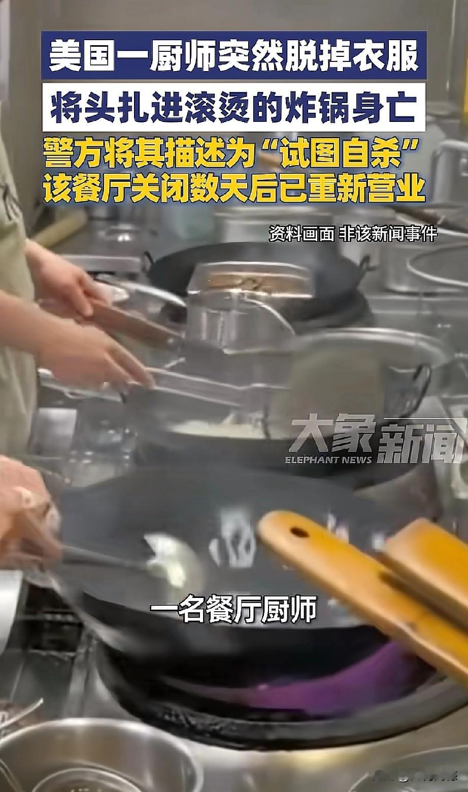 大漂亮世界,无奇不有,近日美国宾夕法尼亚一个餐馆的一名厨师,突然脱光了衣服,把自己的头扎进了滚烫的油锅里,由于受伤严重,最后抢救无效死亡。看到这个消息之后,感觉特别的惊讶,这个厨师为什么要选择以这样的方式结束自己的生命?也许这个人脑袋是有问题了,在大漂亮这里,脑袋有问题的人也特别多,奇葩的事也特别多,层出不穷,令人咋舌!