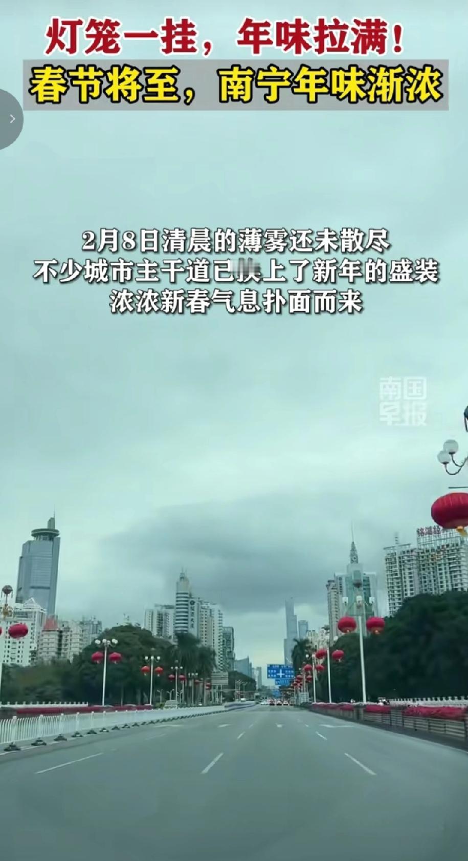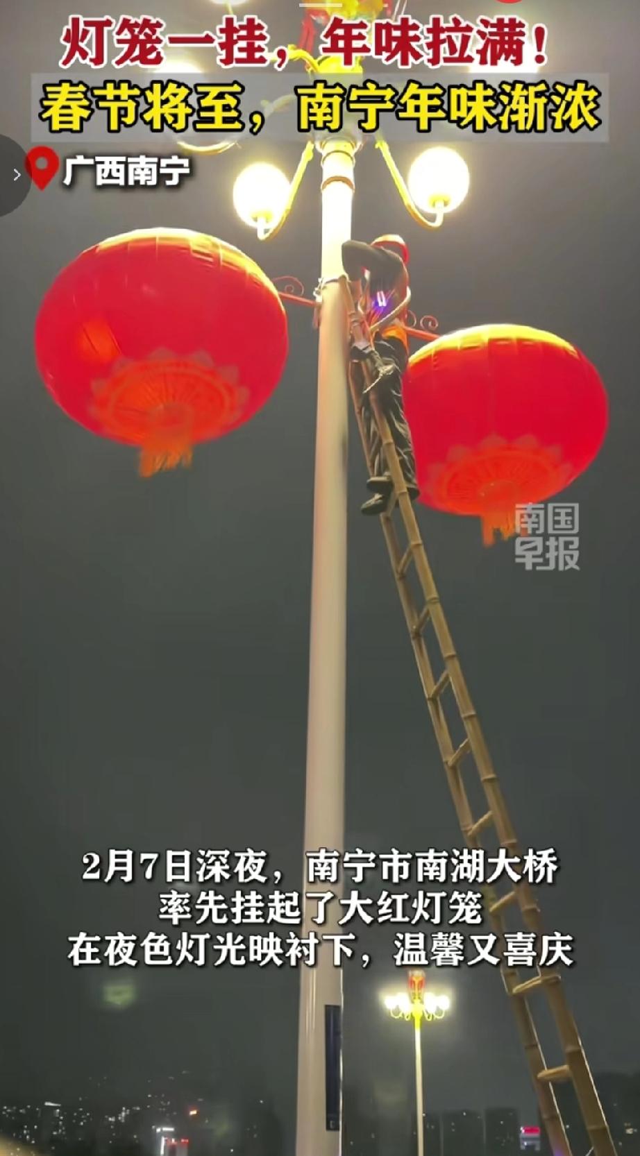 2月8号早上醒来,看到南宁市区许多主干道两旁挂满喜庆灯笼,那场面太震撼了。前一晚11点多,工作人员就在民族大道南湖桥头挂灯杆灯笼,大红灯笼迎风飘,和道路景观相互辉映,节日氛围瞬间拉满。 这次春节氛围营造,在民族大道、平乐大道等路段悬挂1462组灯杆灯笼、473组中国结,作业时间从2月7日到10日。到了晚上,中山路钟鼓楼也亮灯了,16盏大红灯笼点亮,与裸眼3D大屏相得益彰,吸引好多人拍照。这灯笼和钟鼓楼,不仅装点了城市,也让大家对春节更期待了。 (来源于@南国早报 )