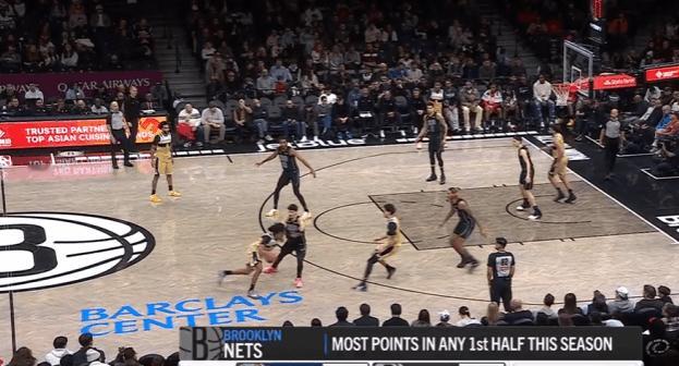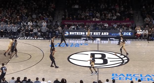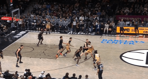 P5队友持球行进至低位转背身发牌,吉尔和莱利随即衔接“Flare Slip”配合,莱利上前接球后立即使用一二步急停拔起出手三分,以波特的招式顶着波特扑防干扰打进3+1。