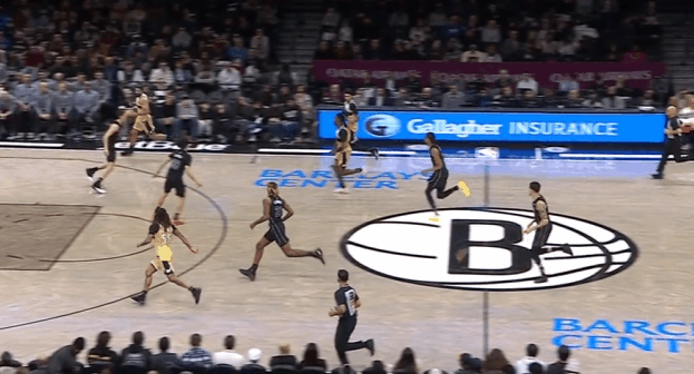 P4持球过半场后立即和吉尔在弧顶发动挡拆,推球变向走掩护墙一侧摆脱追防人,突破行进间撩起手臂+演技逼退身后掏球的萨拉夫和弱侧刷卡的曼恩,随后长驱直入如入无人之境直接起双手扣篮终结。