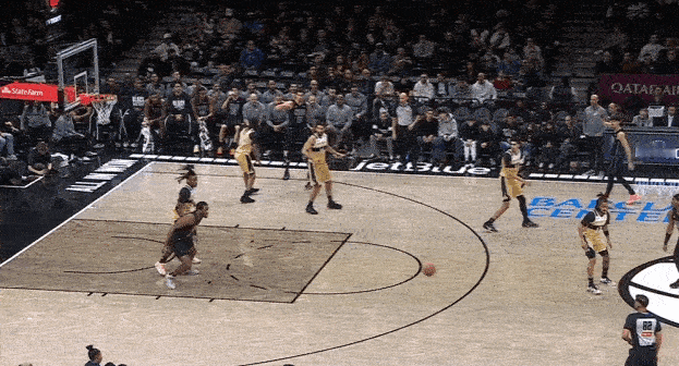 P1萨拉夫弧顶接球,夏普立即上提与其发动挡拆配合。下顺长驱直入接萨拉夫空接球领人,空中对抗顶着起跳干扰的吉尔高难度终结打进。