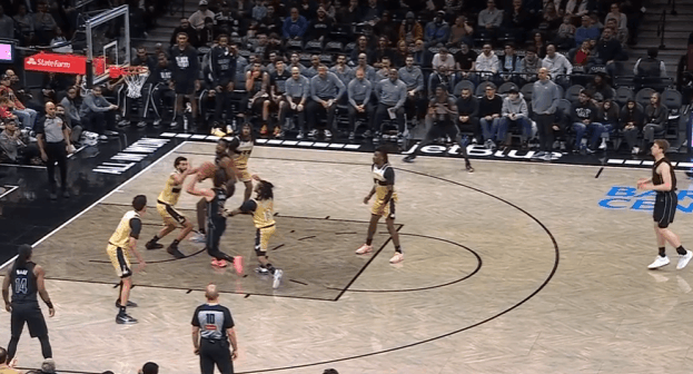P5转换进攻曼恩持球突破直杀篮下,跳起后一记精妙绝伦的不看人背传找到篮下夏普,夏普接球小停顿点飞篮下护框的吉尔后抓节奏差上篮,稳稳打进。