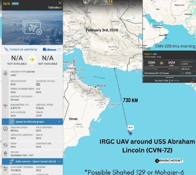 “林肯号”当时位于距离伊朗南部海岸约800公里的国际水域。这个位置虽然远离伊朗本土,但对伊朗现役的中程无人机而言,并非遥不可及。沙赫德-139最大航程超过2000公里,具备长时间滞空能力,完全有能力从伊朗境内起飞,深入阿拉伯海侦察甚至俯冲威慑。