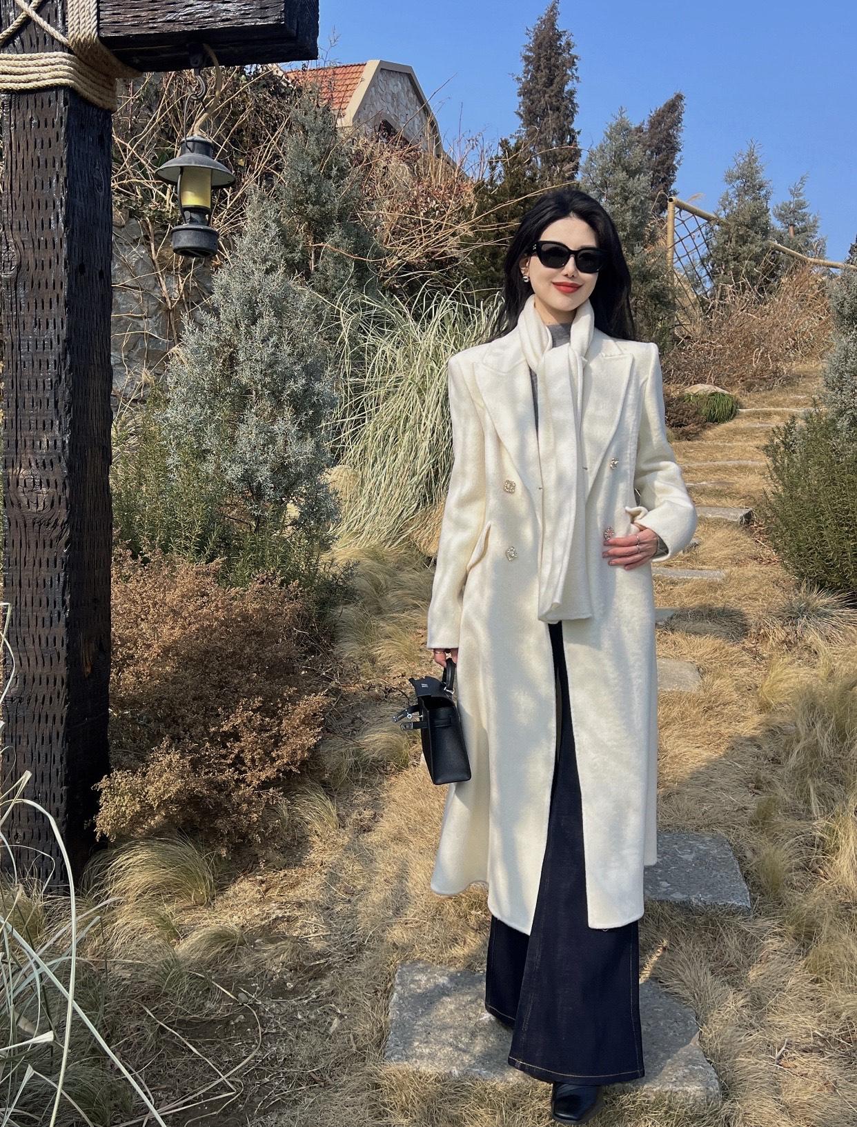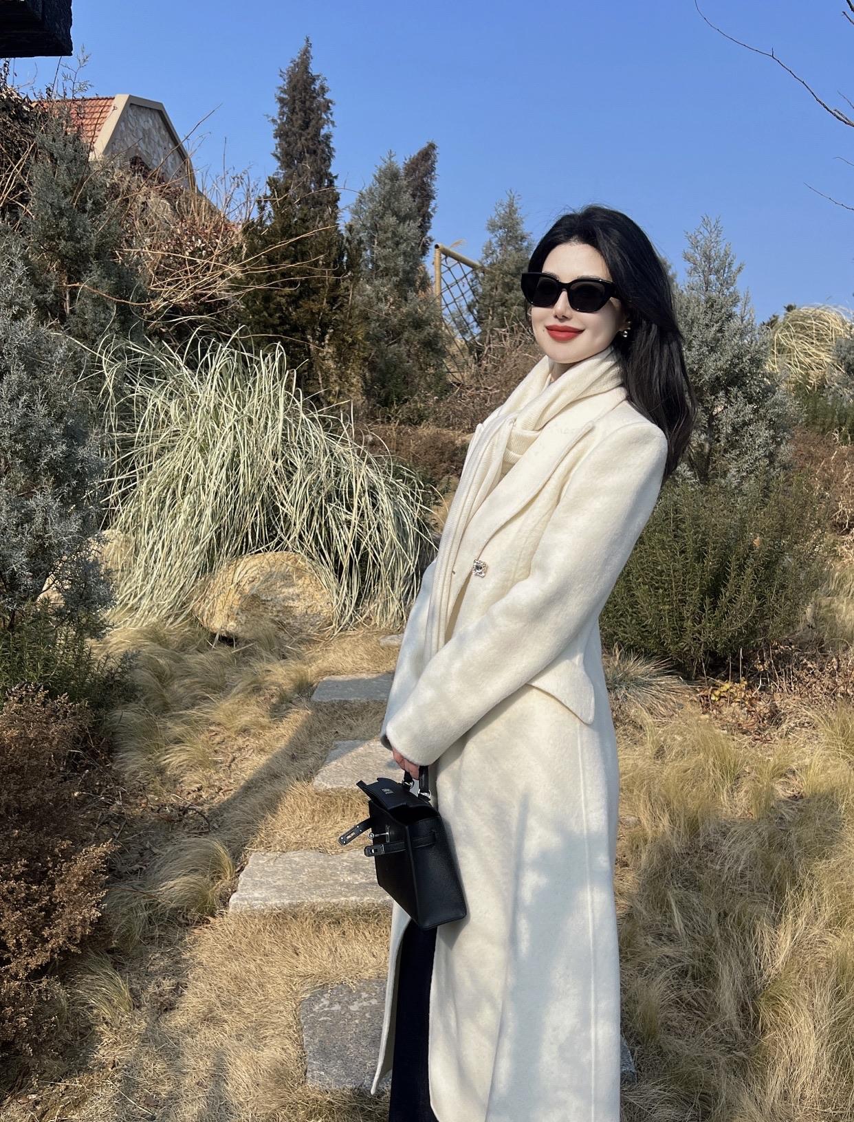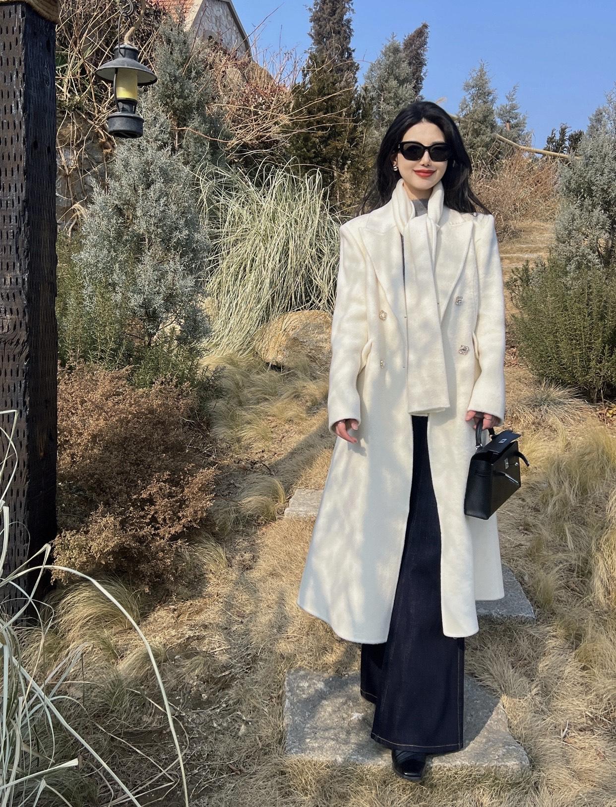 高级感穿搭,温柔风穿搭。冬日暖阳下,优雅的白色大衣与墨镜相得益彰,漫步在自然之中
