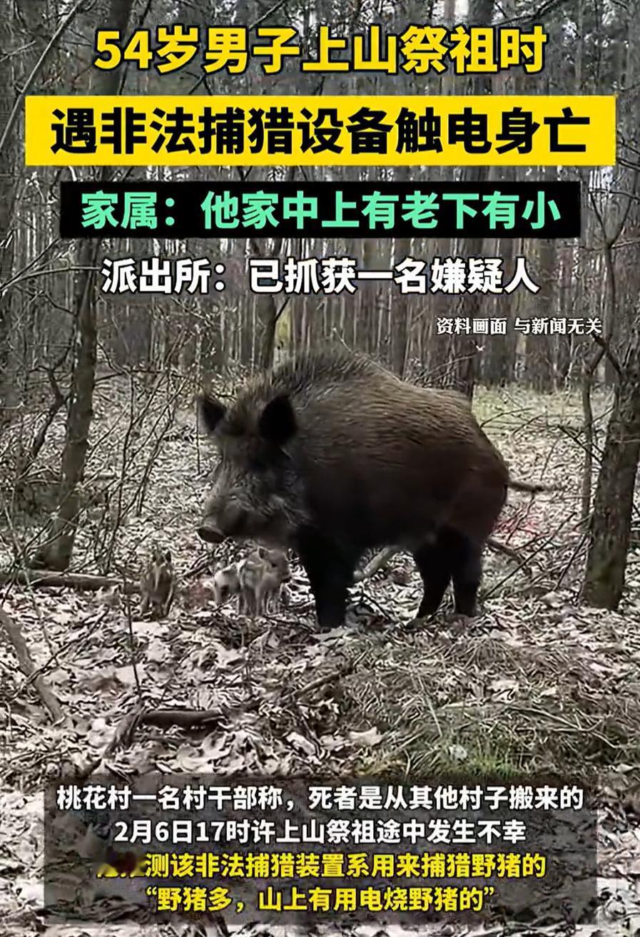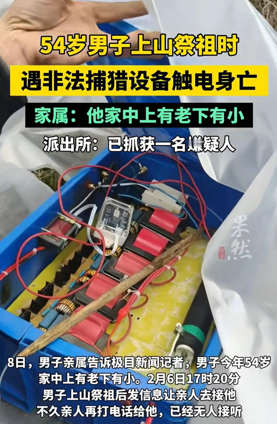 必须严惩!重庆,一男子上山祭祖,一开始还给家人发信息去接他,可后来家人打电话就无人接听了,家人预感不妙,找到时发现他遇非法捕猎设备触电身亡,而男子亲属表示,他上有老下有小,正是家里的顶梁柱 事发当天,男子揣着祭品出门上山,要去给先人扫墓。山路一米来宽,两旁杂草长得密,但村里人常走,谁也没觉得有什么危险。出门前他还给家人发了信息,说祭拜完了,让家里人去山脚下接他 谁也没想到,这条寻常信息成了最后一句话 家里人左等右等不见人,打电话过去,手机通了却没人接听。天色渐暗,一家人心里开始发慌,赶紧叫上邻居,拿着手电筒往山上找。沿着那条熟悉的山路,他们一路走一路喊,回应他们的只有山里的风声 终于,他们在山中一处草丛密集的地方发现了男子的遗体。他倒在地上,皮肤紫黑,裤子在膝盖处烧出了焦黑的痕迹。而在他的旁边,草丛里藏着一套非法的电网装置,这便是他失去生命的原因 这个电网装置并不起眼,电瓶用塑料膜包着,电线铺在地上,藏在杂草里,不仔细根本发现不了。最让人愤怒的是,这种装置不仅没有任何警示标志,也没有一丝防护措施,导致了无法挽回的悲剧。 村干部推测,这种装置原本是用来电击捕猎野猪的,山上野猪较多,但它所带来的危险显然远超捕猎者的预期,他们也是嫌疑人被抓到后才得知此事 有网友说:这种行为太恶劣了,安装高压电线捕猎本身就是违法行为,何况因此致人死亡 按理说,野生动物捕猎是违法的,使用这种电网装置更是极其危险。不仅违反了环境保护的规定,还在无形中威胁到无辜人的生命安全 男子的死,给他的家庭带来了难以弥补的痛苦,特别是他还肩负着上有老、下有小的家庭责任,是家里的顶梁柱。这个悲剧让人痛心的同时,也让我们更加深刻地认识到非法捕猎行为的危害 我想,祭祖原本是一件充满敬意和安宁的事,结果却因一场非法捕猎的意外,成了永别。这种事件,不能只是当作偶然的悲剧来看待。我们要严厉打击这类非法捕猎活动,也要加强对这种电网装置的管控