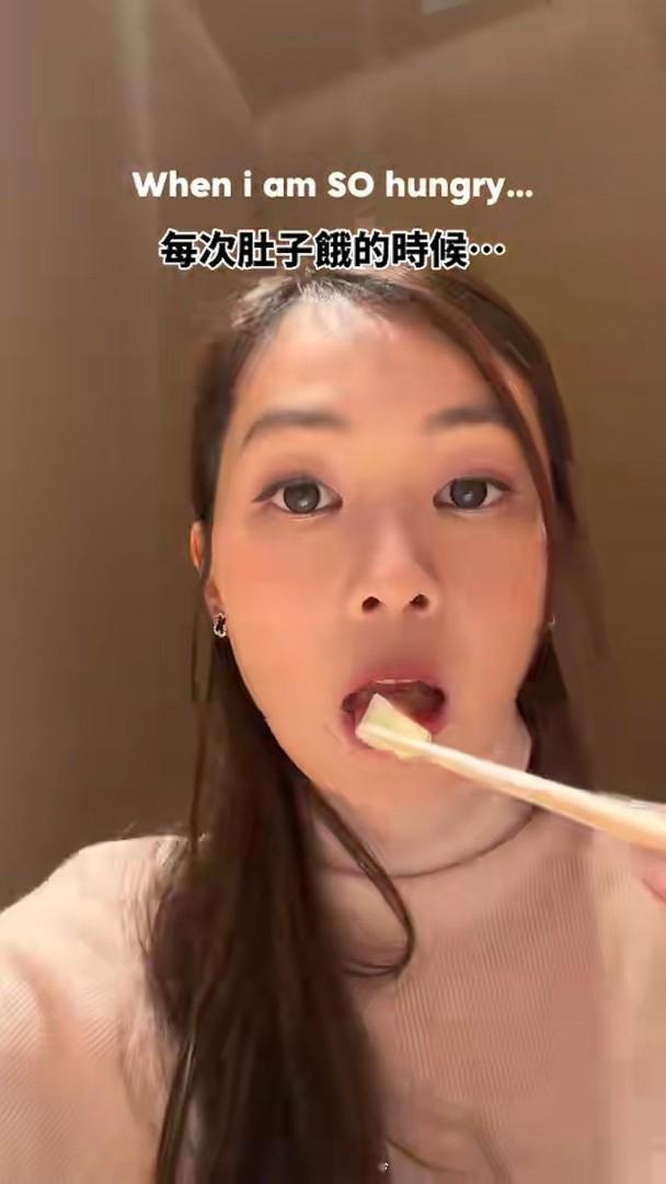 郭柏妍入行後愈來愈靚,而且很有觀眾緣,清純形象深受觀眾和網民喜愛,是TVB的人氣小花,也是不少人心目中的女神。除了天生麗質,她後天也付出了不少努力才能時刻Keep住最住狀態。要保持Fit爆身材,她除了努力做運動,也很注重均衡飲食,必要時甚至要忍口節食減肥。日前郭柏妍就於社交網分享了一段短片,寫道:「每次肚子餓的時候… 吃啥 控制飲食」,片中她只用筷子點了點豉油便放進嘴裏,之後又夾了一粒疑似是前菜的薑食物吃,即使餓了也就只是吃那麼一點點,令不少網民大為震驚,有網民就留言問道:「對自己好啲可以嗎?」