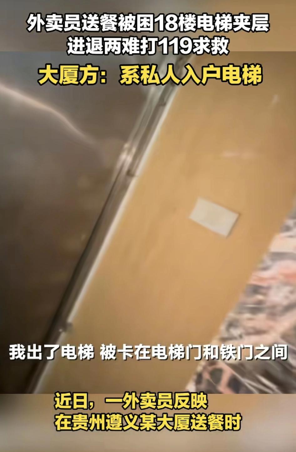 贵州遵义一位外卖员在一所大学送外卖时,出了电梯被卡在了电梯门和铁门之间。这时看到上线按钮只剩下一根电线,最后还是打救援人员的电话才得以脱困。物业人员称该外卖员所乘的电梯是入户电梯是属于业主们所有。大厦已经张贴多张告示,告知外卖员不能误闯电梯。这种情况,作为点外卖的业主,应该有义务告知外卖员。