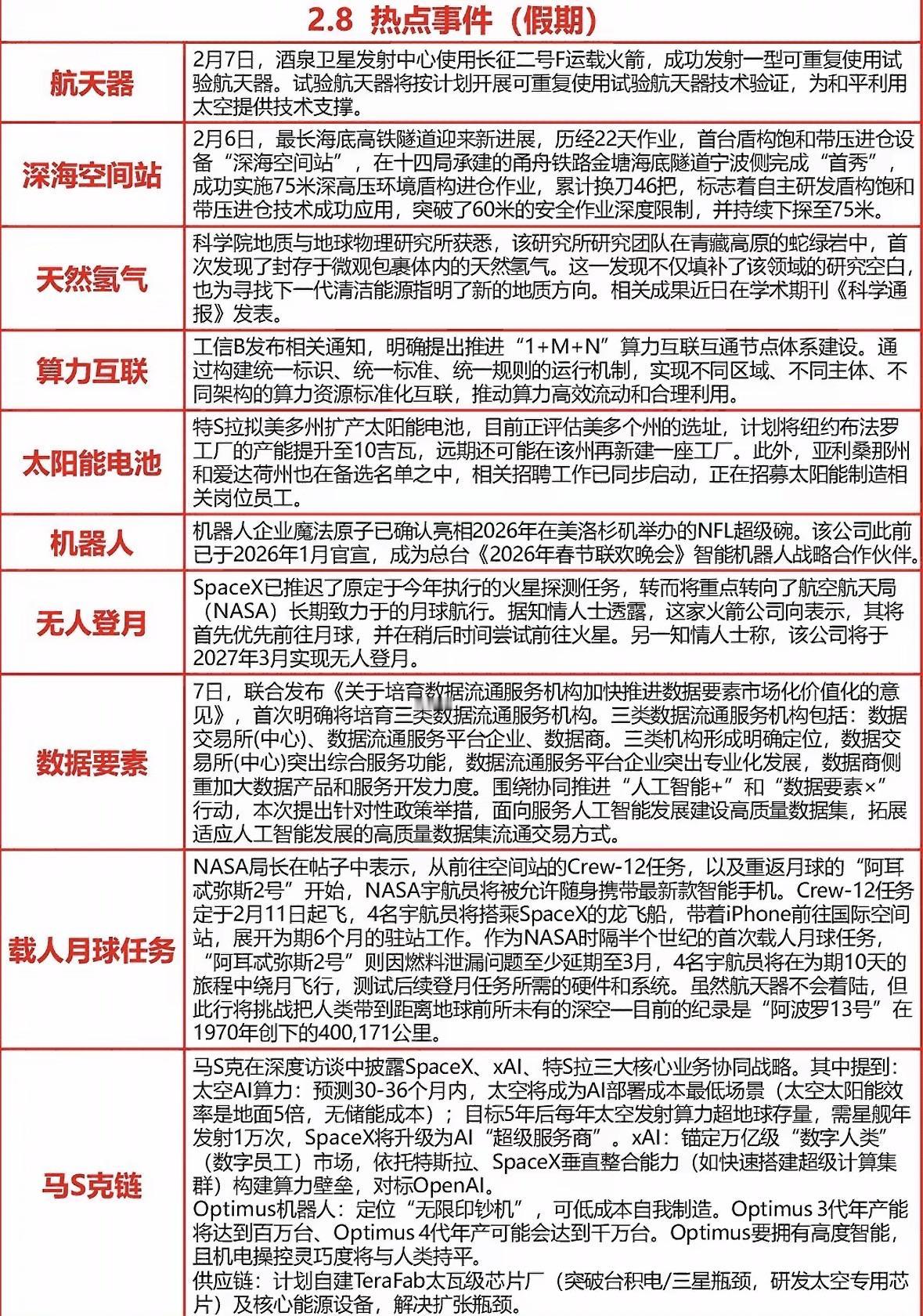 2月8日热点新闻报道汇总 中国航天成功发射可重复使用试验航天器;海底高铁隧道突破深潜技术;青藏高原发现天然氢气;算力互联互通体系加速建设;特斯拉扩产太阳能电池;机器人亮相超级碗;SpaceX转向月球探测;数据流通机构培育启动;宇航员将携手机进太空;马斯克布局太空算力与AI。