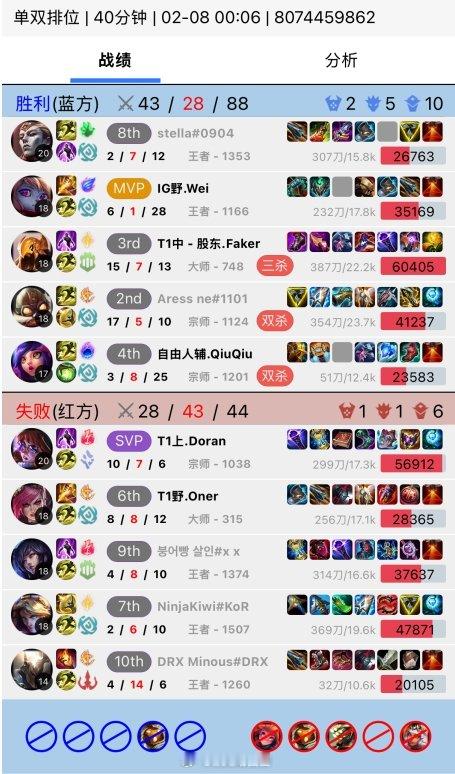 根据韩服排位统计小程序显示,今日凌晨Wei韩服排位排到Faker,Wei使用波比,Faker使用沙皇。