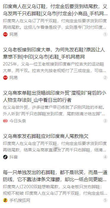 印度商人在义乌订了两千双鞋,付完定金后要求货到印度再结尾款。结果义乌商家直接发了两千只右脚鞋,说尾款结清才给左脚鞋。这招儿乍看像是段子,实则是专门对付印度人的。 麻烦看官老爷们右上角点击一下“关注”,既方便您进行讨论和分享,又能给您带来不一样的参与感,感谢您的支持! 不少人刷到过印度商人在义乌订鞋,商家只发两千只右脚鞋的视频,乍看像段子,其实是义乌中小外贸商户,在长期风险中摸索出的无奈自保手段。 作为全球最大的小商品集散中心,义乌和印度的贸易往来十分密切。官方统计显示,2024 年义乌对印度出口额达到 284.21 亿元,印度长期稳居义乌主要出口市场前列,印度客商是当地小商品采购的重要群体。 正常的跨境贸易多遵循约定付款流程,但部分印度客商长期坚持特殊合作模式,只愿意支付少量定金,坚持等货物运抵印度港口后,再结清剩余尾款,这给义乌商家埋下了巨大风险。 过去多年里,大量义乌商户遭遇过类似陷阱:货物到港后,对方以款式不符、质量瑕疵、清关延误等理由拖延付款,甚至直接失联、拒绝提货。 跨境物流与港口成本高昂,货物长期滞港会产生巨额滞箱费、仓储费,不少商家为减少损失,只能被迫折价处理,甚至钱货两空。跨国诉讼流程繁琐、成本高、执行难,中小商户很难通过法律途径挽回损失。 正是在这样的背景下,出现了广为流传的订单案例。一位印度商人向义乌鞋类商家订购两千双鞋,按约定支付定金后,临时提出变更付款方式,要求货物抵达印度再结清尾款。 这位商家深知货到印度后的风险,没有直接拒绝订单,而是采取了特殊应对方式,仅向对方发送两千只右脚鞋,并明确告知,尾款足额结清后,再补发对应的左脚鞋。 这一操作看似非常规,却精准卡住交易主动权。单只右脚鞋不具备正常销售价值,对方无法通过拖欠尾款获利,只能要么按约定付款,要么自行承担已产生的物流与定金成本。 这不是个别商家的临时之举,而是义乌外贸圈针对高风险合作方的通用应对策略,核心是用低成本方式锁定交易安全,避免陷入被动。 除了分开发货这类灵活手段,如今义乌商家已形成一套完整的风险防控体系。合作前会多方核查客商资质与过往信誉,避开有拖欠记录的客户。 合同条款会细化付款节点,采用分批出货、分批结算的模式,每一批次货款结清后再安排下一阶段生产或发货,不轻易接受大额账期与远期付款。 同时,越来越多商户选择购买出口信用保险,遇到买方恶意拖欠、拒收等情况,可通过保险理赔降低损失,这也是官方与金融机构支持中小外贸企业的重要方式。 从表面看,只发右脚鞋是略带戏谑的应对方式,背后却是中小外贸商户在不对等跨境贸易中,为守住经营底线、保障自身权益的现实选择。 义乌商家并非刻意针对某个国家的客商,而是针对长期存在恶意拖欠、违约拒收的行为,建立起自我保护机制。在信任缺失、维权成本过高的跨境交易中,这类务实策略,成为中小商户维系生存、稳定经营的重要支撑。 随着贸易规则不断完善、信用体系逐步健全,以及商家风险意识提升,这类极端应对方式正在减少。但这一案例也真实反映出,中小外贸人在全球化贸易中,既要抓住订单机会,也要时刻守住风险底线,用智慧与规则守护来之不易的经营成果。