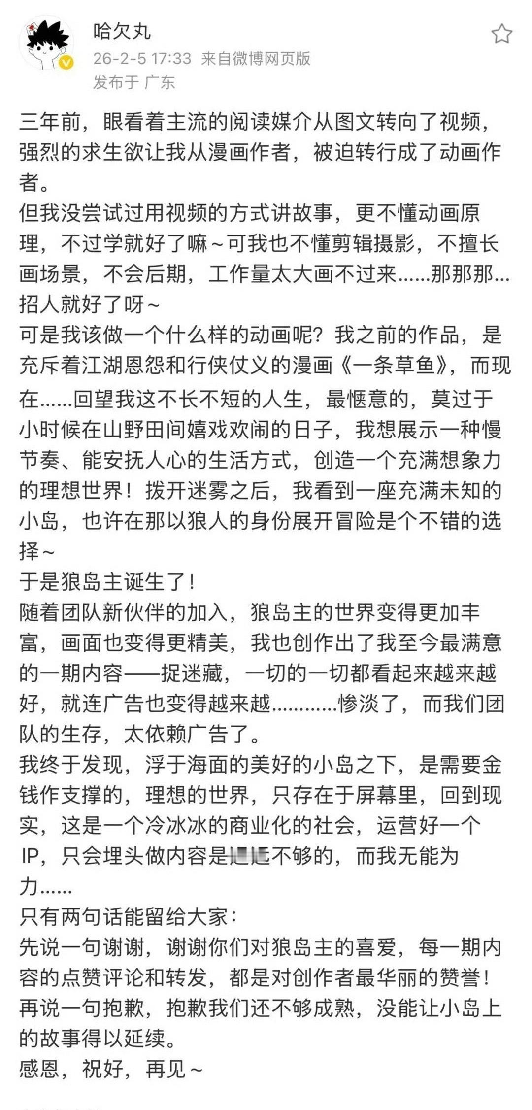 放进了名为“未完待续,但可能永远待续”的收藏夹。狼岛主啊,我曾以为能看着那座岛一点点建起来,看着狼人们的故事慢慢展开。现在,它成了互联网海洋里一座永远定格在建设中的“烂尾岛”,美丽又遗憾。狼岛主说做原创动画是一场豪赌