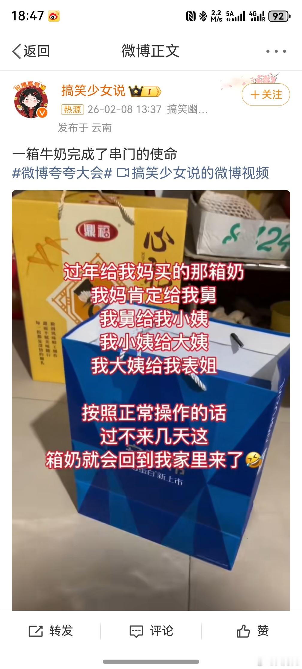一箱牛奶完成了串门的使命 ,所以我说过年送礼是真没必要,现在这个年代,谁家也不缺吃不缺穿的,过年集中送礼就会导致积压,最后消耗不了,还浪费了。