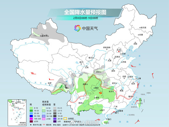 【#新一轮大范围雨雪天气来袭#】#南方阴雨湿冷北方率先回暖# 未来三天(2月8日至10日),我国将迎来新一轮大范围雨雪天气过程,其中西南地区降水频繁。伴随阴雨,南方大部升温缓慢,西南等地湿冷感明显,与此同时,北方大部将率先回暖。进入中旬,南方升温加速,中东部大部将明显偏暖。中央气象台预计,今天,新疆北部、西藏东部、青海南部、甘肃南部、陕西中南部、川西高原北部等地部分地区有小雪或雨夹雪,其中,新疆伊犁河谷、西藏东北部等地部分地区有中到大雪;西藏东南部、四川中东部、云南东部、重庆、贵州、湖南、广西西部、海南岛、台湾岛东部等地部分地区有小到中雨。今天,云南东部到华南一带仍将出现降温,最高气温达20°C以上的区域会进一步缩减,大部地区的最高气温将降至15℃左右,仅云南西部、广东沿海以及海南岛等地最高气温还可达20℃以上。在中东部其它大部地区,未来6天将以升温为主,其中北方升温节奏较快,明天最高气温0°C线就会北抬至东北地区中部。(人民日报)