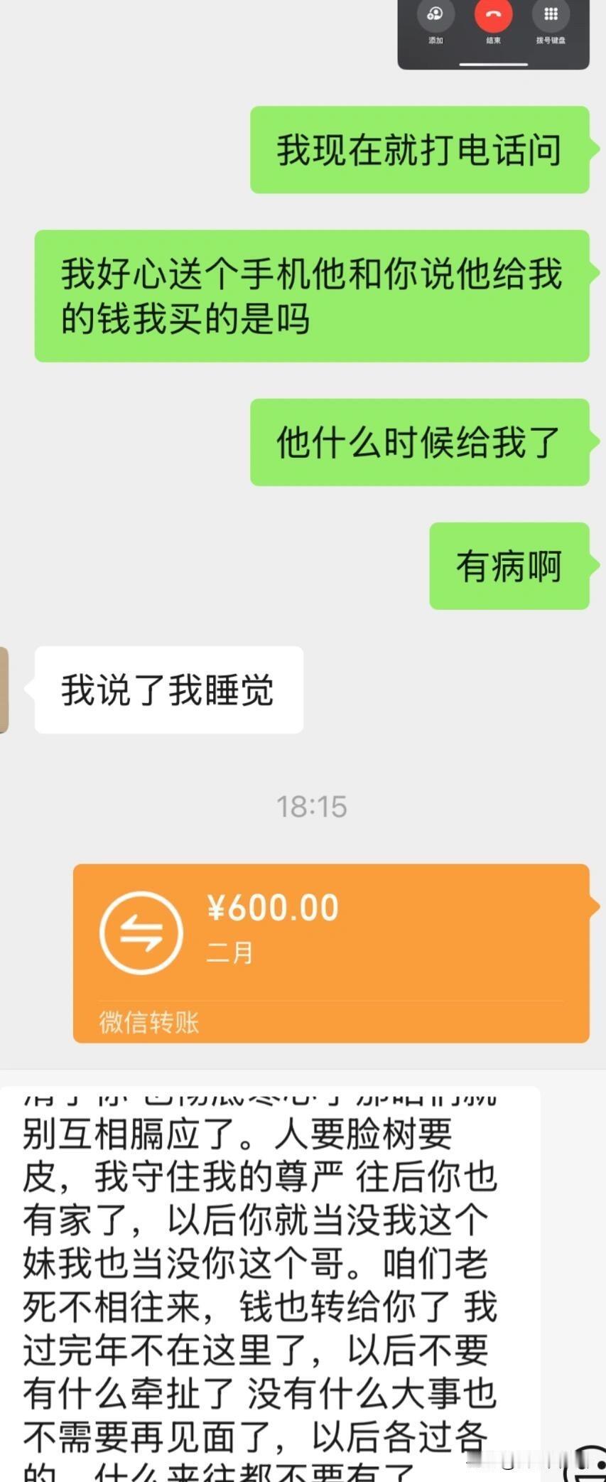 兄妹彻底决裂了 我哥结婚了,我在哥哥所在的城市附近工作,我一个人住家里你放心,哥哥有其中一套房子让我和我嫂子住,(我不想包住每月给600块钱给我侄子) 我辛辛苦苦挣了一年了,给我爸买了一个17promax,我哥知道后大发雷霆,说了各种各样的难听的话,还骂我说我爸一个普通人用那么贵的东西干什么,我说我买了一个promax买大了,又买了一个pro,和爸爸开视频爸爸开玩笑说送给我吧,我说可以我看见爸爸很开心很激动的表情高兴了好几天,我爸说他终于也用上一万块钱的手机了,很开心,我就送给我爸了… 我哥知道后说发怒说我爸一个五六十的老头用什么苹果手机,用个一两千的就行了,用那么贵的你有钱烧的啊,一直在斥责我,还骂我 还说你嫂子知道了怎么想,他找我闹怎么办,我说我花的是我自己的钱,我又没花爸的钱,我哥说最好是这样 别让我以后知道了你是花爸的钱你就等着,我说明天你就去查汇款记录看看,我要他的钱了吗,他就一直在骂我,让我离开这里他再也不想看见我,我至今都没想明白,我做错什么了吗,我只是想尽一份孝心,以前没上班我喜欢什么我爸爸什么都给我买,我不想让我爸羡慕别人,我省吃俭用买了部手机却被说的流了好多眼泪,我哥还说让你嫂子知道了怎么怎么样,我花我自己的钱,我就给我爸打电话问这个手机钱是你给我的吗,我爸说明天去查汇款记录不是他给我的,我就说你一共就给我过一次手机钱,还是前两年我过十八岁生日 你给我了9000我又凑了一千,没舍得换手机我哥买房乔迁凑了一万我都免费给他转过去让他买家具了,说完我哥更气了,我哥说你说这个干嘛,你嫂子在旁边你说这个,你嫂子又找我事怎么办,你过生日爸给你9000,你嫂子过生日爸给600,说完又开始骂我,我真受够了,已经准备过年离职彻底决裂了 和哥哥虽然是亲兄妹,他从小到大他对我的态度从来没有让我感受都过亲情,这下让我彻底认清了,我也长大了 也有自己的感受和自己的尊严,亲兄妹就像一碗夹生饭,我含着眼泪咽了又咽,哈哈心寒