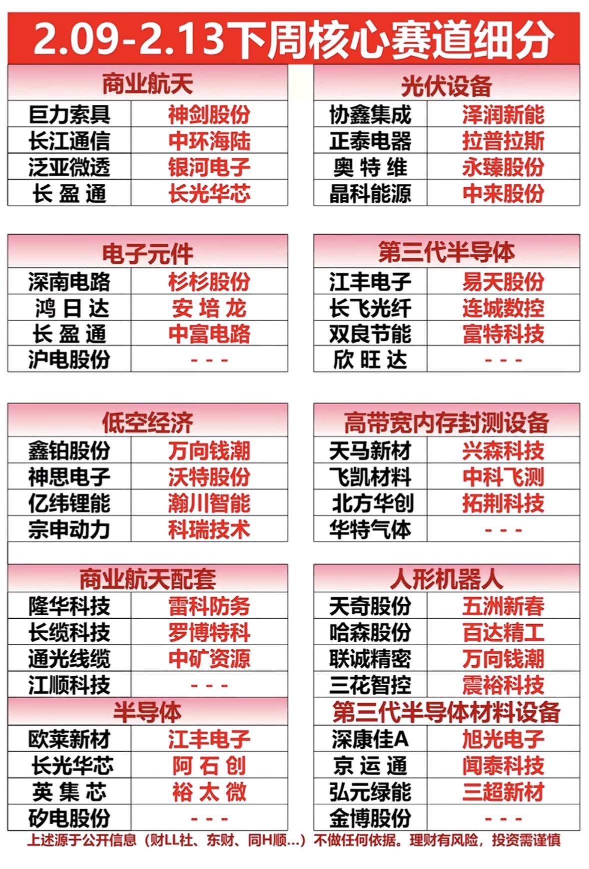 下周核心赛道细分,带你解锁投资新方向!📈💰 下周关注商业航天、光伏设备、半导体及人形机器人等赛道,涉及多家企业。市场有风险,投资需理性。