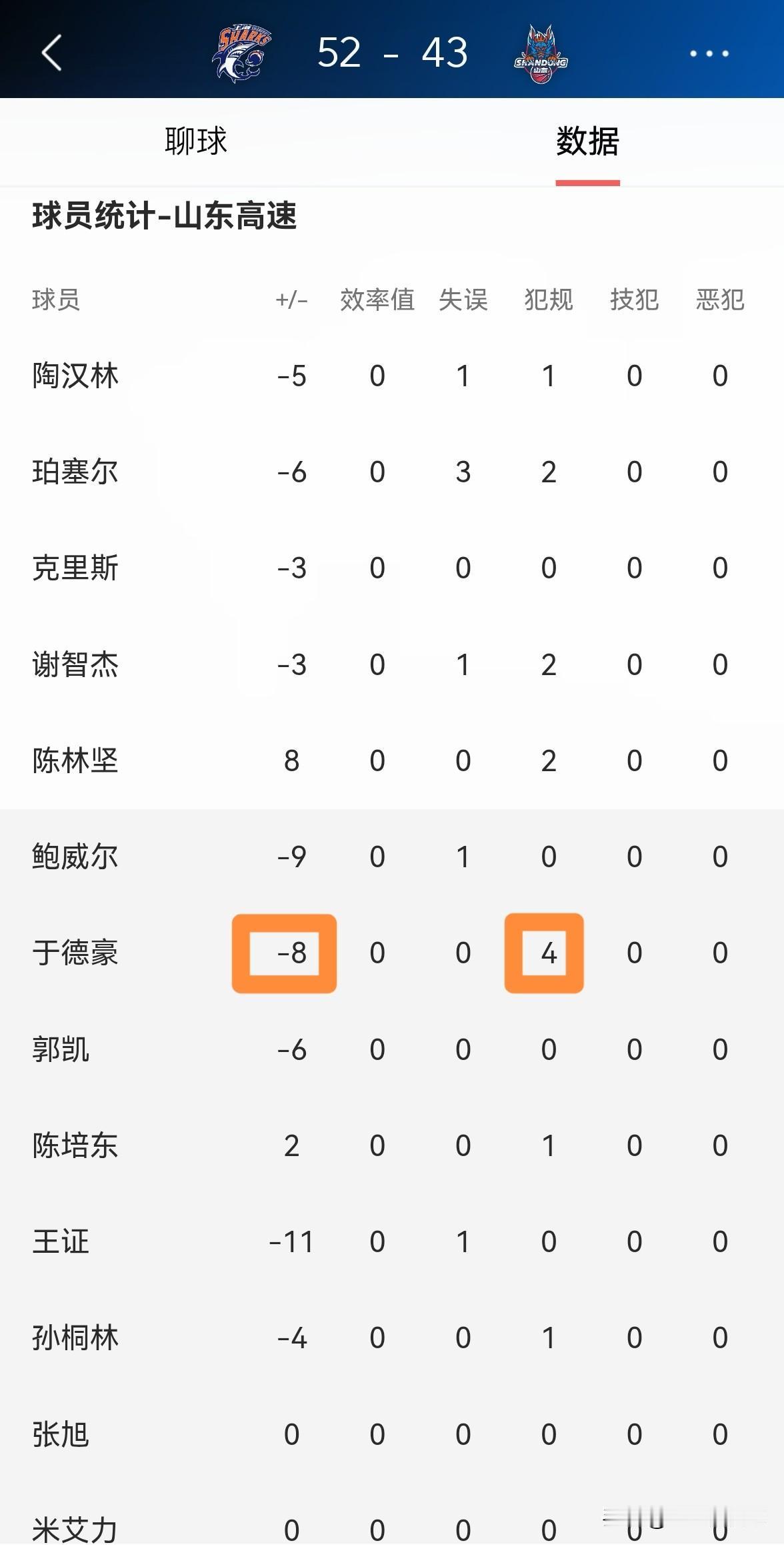山东高速大将于德豪真是名副其实的炮灰!在今天进行的山东高速和上海久事的CBA俱乐部杯半决赛中,目前双方半场战罢,山东高速以43:52落后对手9分。值得一提的是,在前两节比赛中,于德豪完全成为了球队的炮灰,他在替补出战的5分钟里,投篮1中0怒砍0分,却出现了4次犯规,他的场上正负值为-8。 虽然于德豪在上半场比赛中的表现堪称灾难,但是他为了球队的利益甘当炮灰的精神却值得称赞。