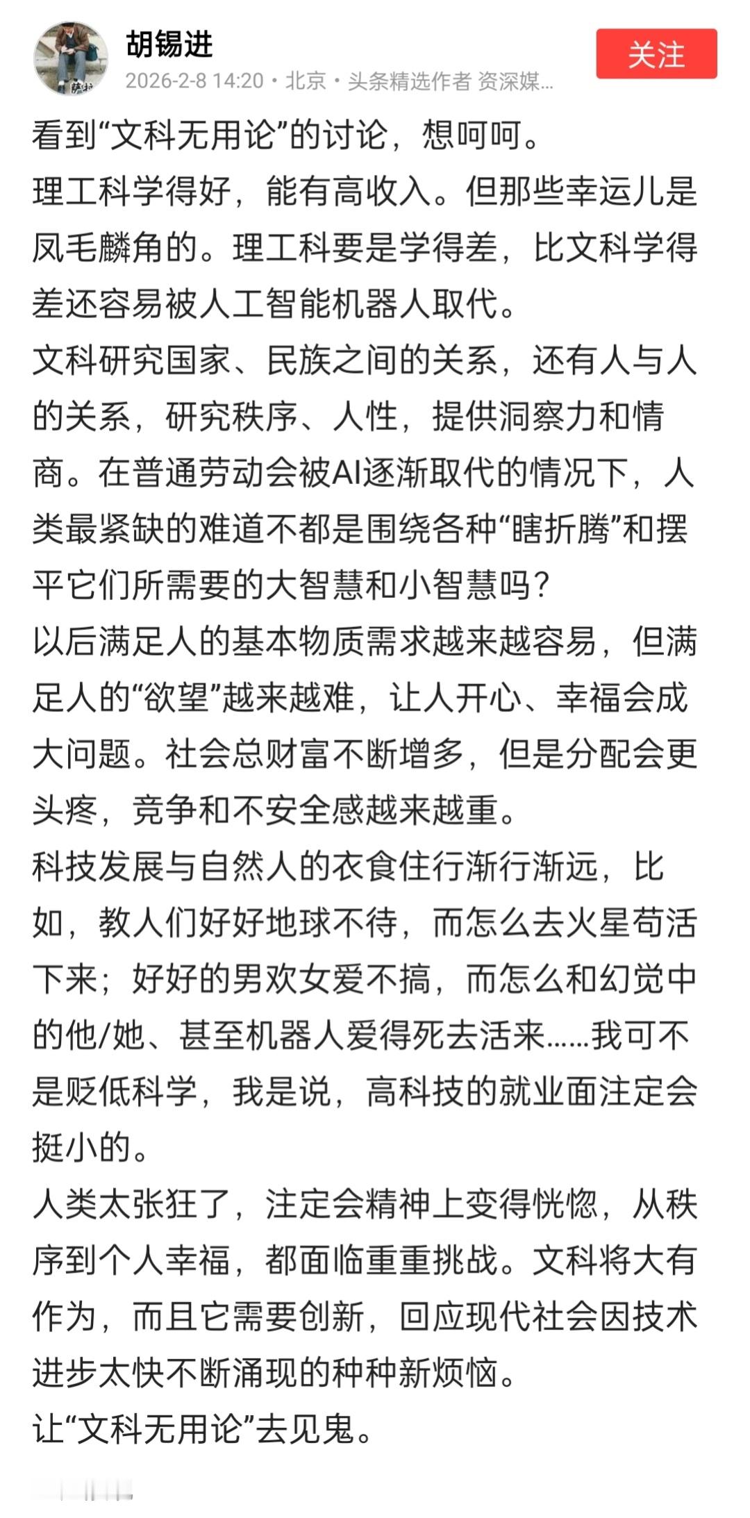 胡锡进:看到“文科无用论”的讨论,想呵呵。