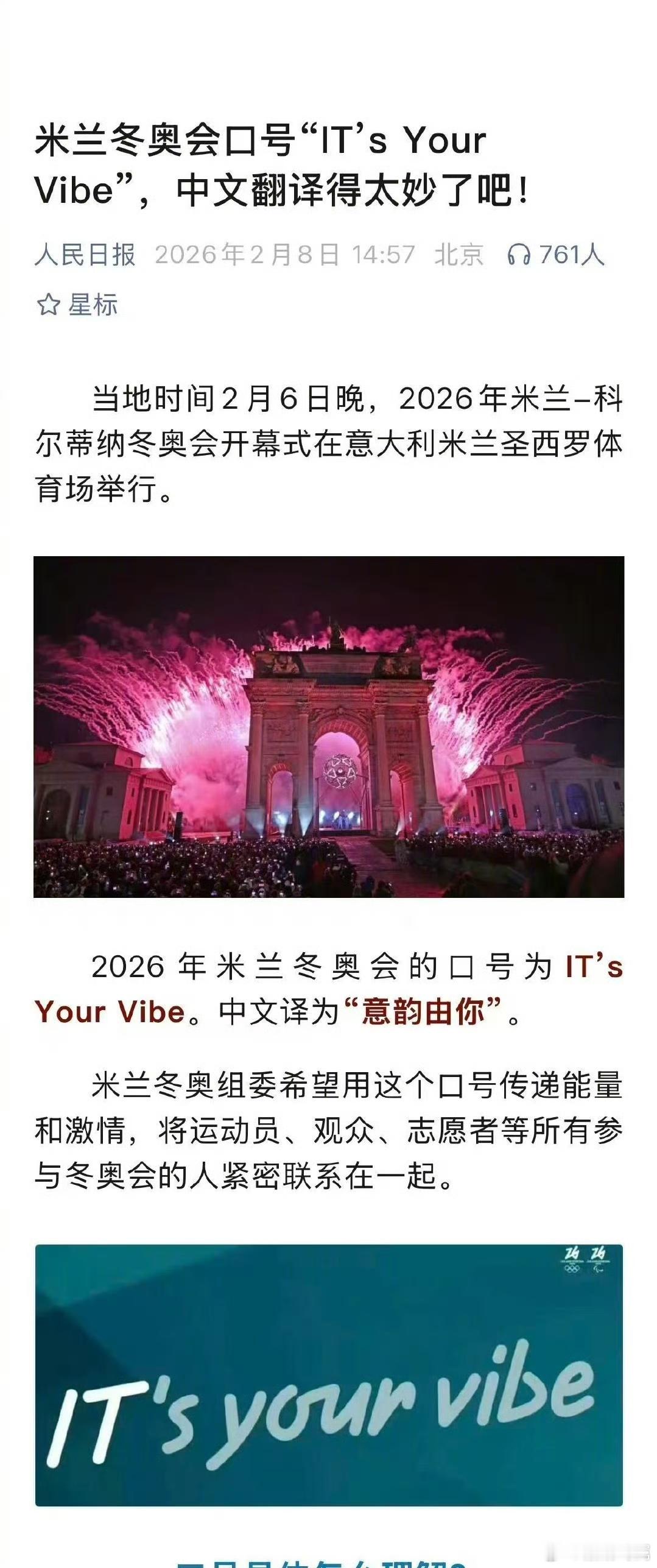 米兰冬奥会口号的中文翻译好妙谁被米兰冬奥这句翻译惊艳到!英文IT’s Your Vibe,中文意韵由你,双关、意境、参与感全都到位,这才是顶级翻译v观冬奥会全民聊冬奥