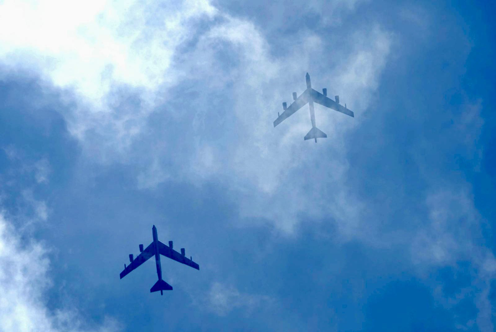 图6-9,菲律宾照葫芦画瓢,找来美国爸爸的B-52H,自己派出FA-50战斗教练机护航,并进行了实弹投掷,看图应该是铁炸弹。FA-50是韩国产的轻型战斗教练机,也是菲律宾唯一的超音速飞机,无中距弹发射能力,整体性能和我们航校的教-10高级教练机差不多。