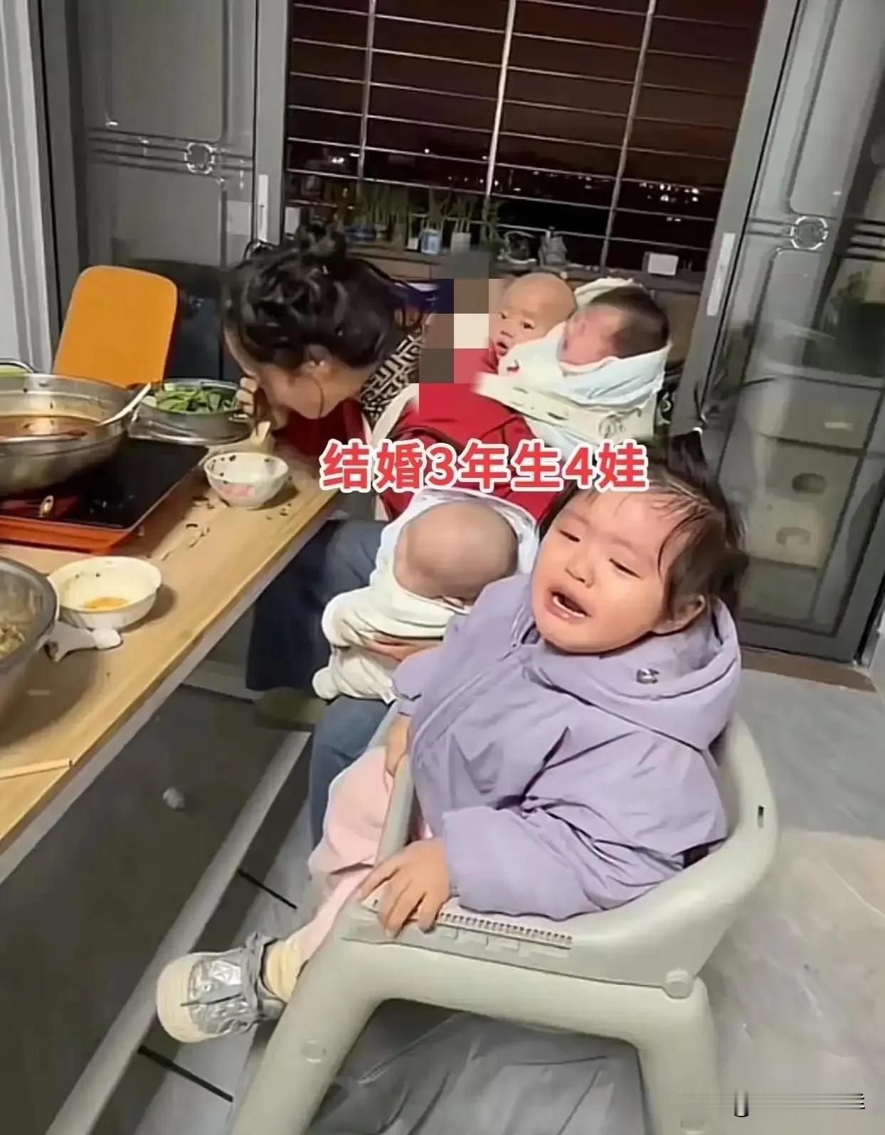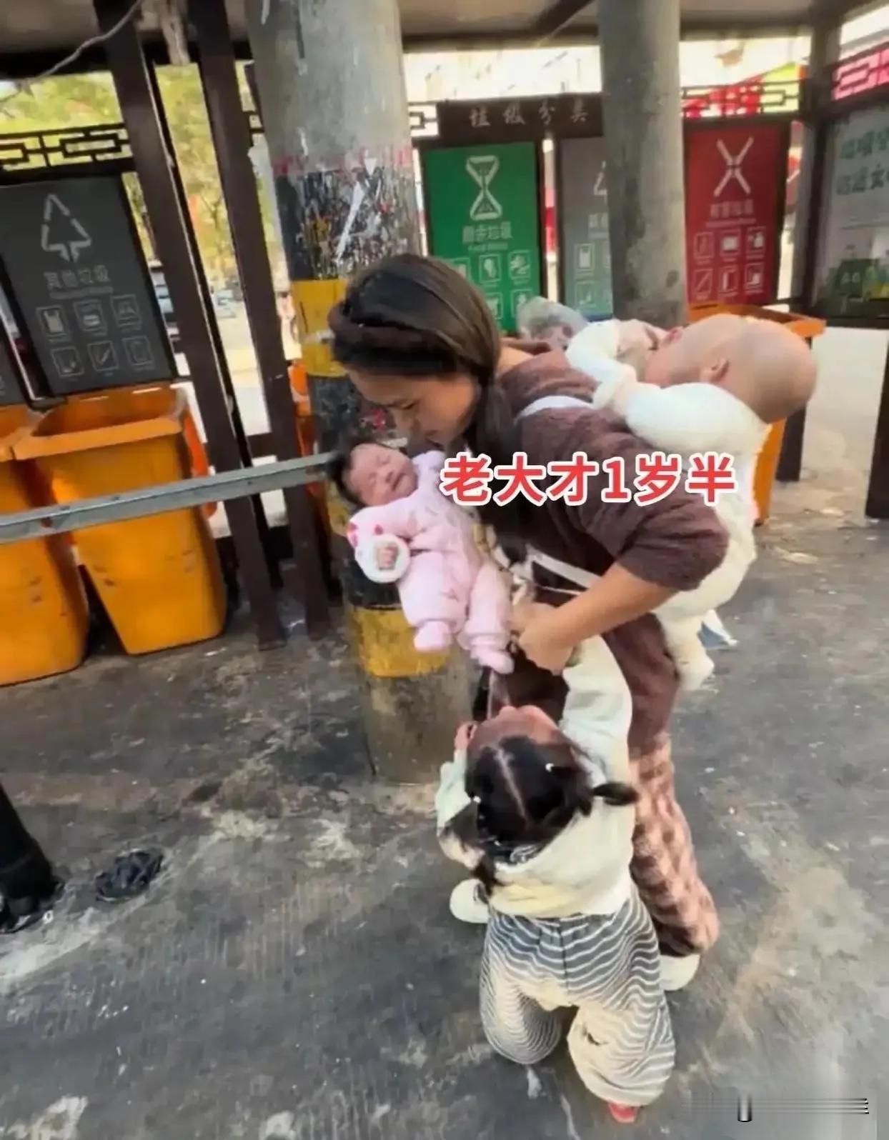 老大一岁半,后面有双胞胎,最后一个在襁褓,十月怀胎,这个女人在生了老大的一年半里居然生了两次,不知怎么生的。