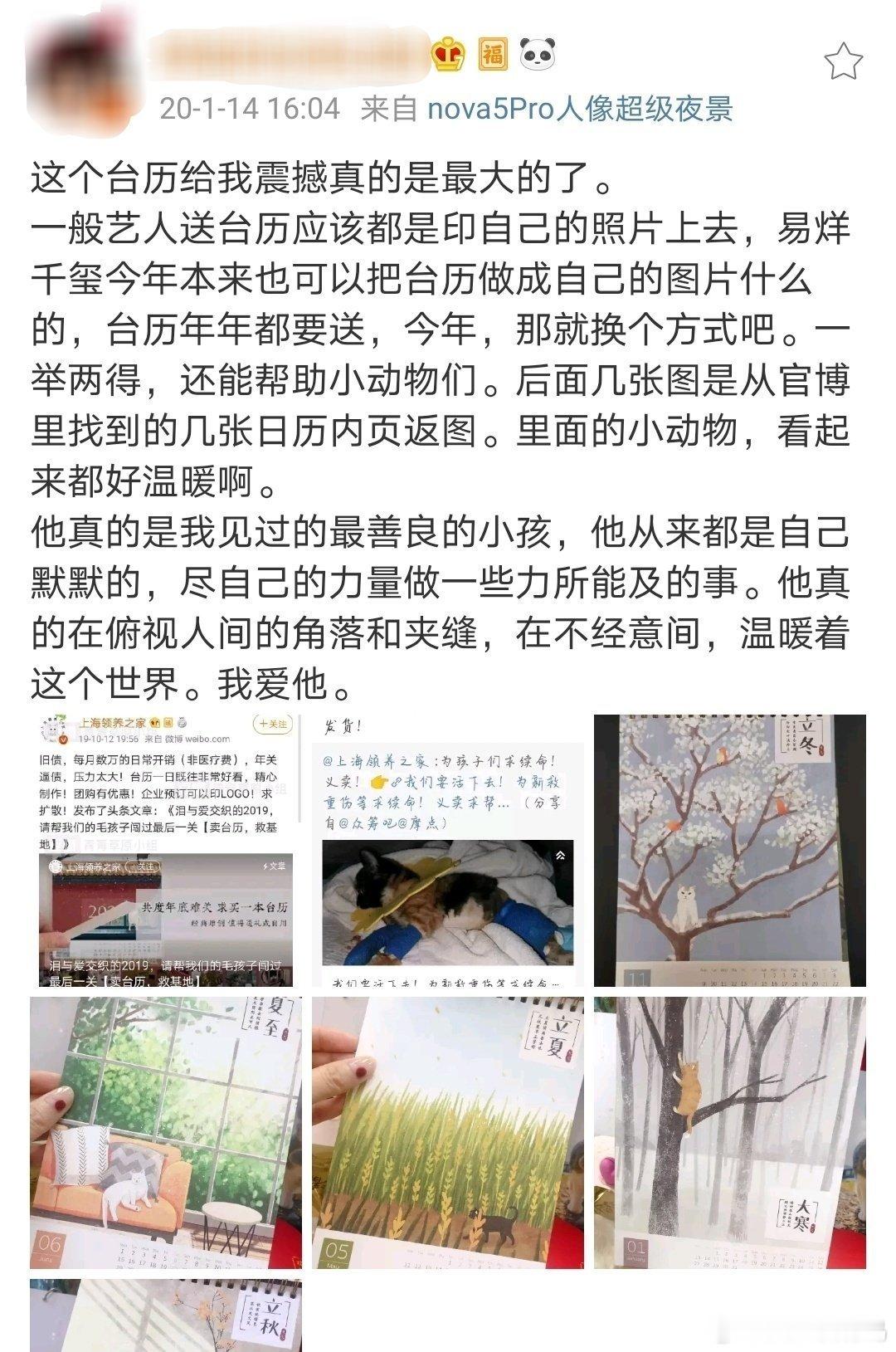 易烊千玺连续七年在新年礼盒放领养之家救助猫咪的台历,这个真特别拉好感