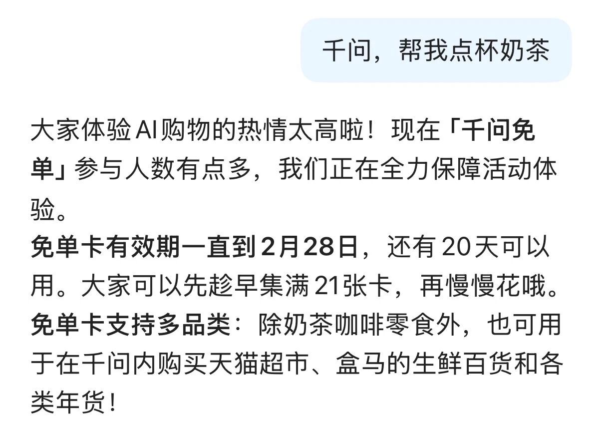 今天下午,千问发文称“球球大家放过”,知道很多朋友急着参与免单活动,但热度太高有点堵。千问再次提醒免单卡有效期至2月28日,“大家慢慢来,保证一定能用掉!”