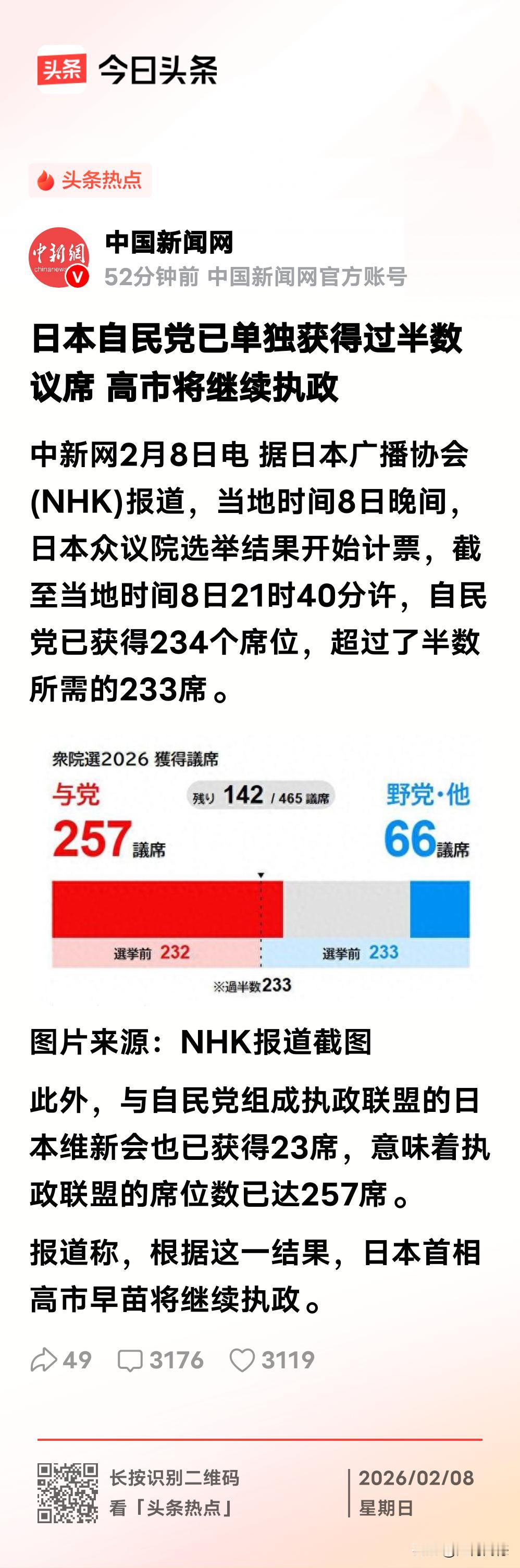 高市真的赌赢了!据最新消息显示,自民党已单独获得过半数议席,高市将继续执政!邱毅教授早在此前就已经进行了分析和预判,认为高市获胜毫无悬念,现在看来,邱教授的预测是很准的,说明他对有关情况是非常了解的,他在预测的时候明确表示,由于在野党毫无作为,高市又非常的会表演,老特又在关键的时候助力,台积电又到日本投资,这些因素的叠加,让高市有了足够的获胜砝码,现在的结果表明,高市的确是赌赢了!