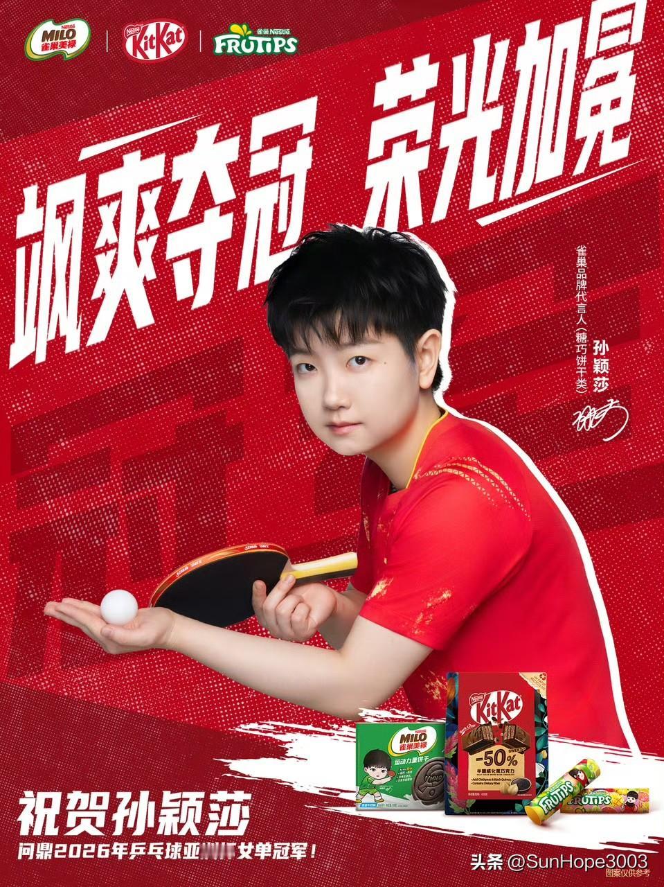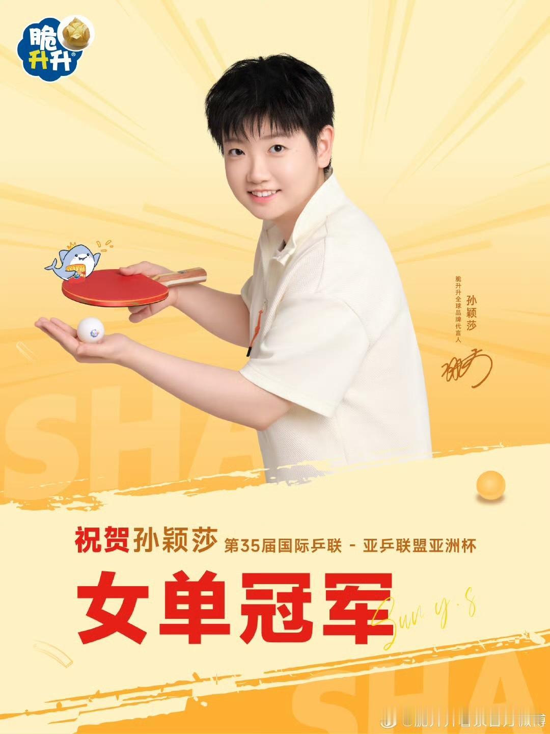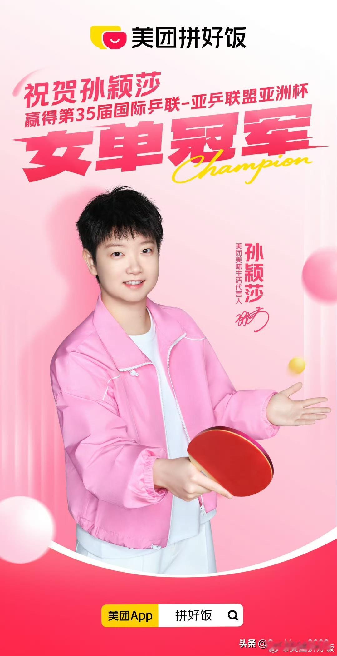 孙颖莎夺得亚洲杯冠军,各品牌方开始陆续的发文祝贺。 海口亚洲杯女单决赛,孙颖莎4-3王曼昱,夺得亚洲杯的冠军, 这也是莎莎的首座亚洲杯冠军杯,也是受伤之后的第一个比赛。 今天的赛场,依然看到了大心脏的莎莎,和大格局的莎莎。 莎莎代言的品牌方还在陆续的发祝贺的信息,和球迷们一起,庆祝胜利!