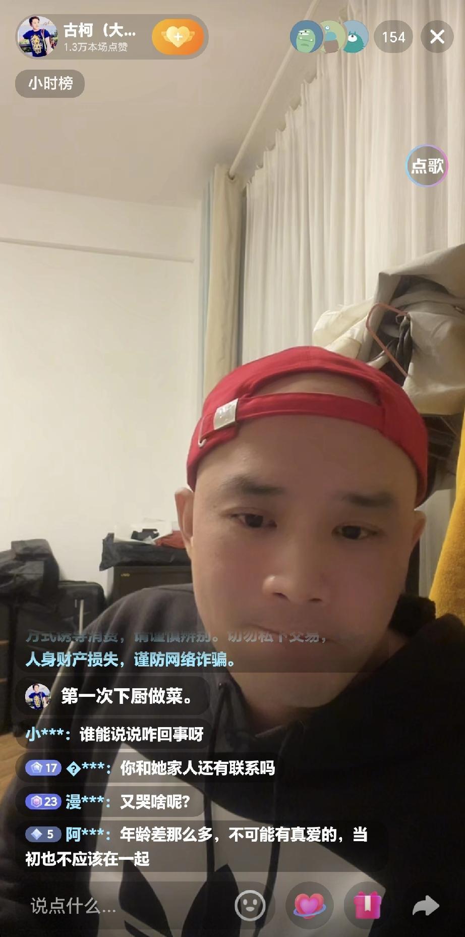 刘晓庆看到前摄影师男友古柯落魄成这样,会不会有一丝心痛? 2月8日,刘晓庆的前男友古柯露面,他已经消失了好几个月了,终于出来开直播,估计是没钱花了吧,毕竟他现在是无业游民。 只见古柯在一个非常简陋的厨房里做饭,吃得也简单,穿得更是破破懒懒,尤其脚上那双鞋子简直不忍直视。 做完饭以后,古柯吃饱便开直播跟网友聊天,视频中的他同样胡子拉碴,特别显老,一看就生活过得不好。 同一时间,刘晓庆开直播卖自己写的字画,她竟然在头上扎了一朵小花,开了10级美颜滤镜,就像20岁一样,好有自信。 刘晓庆的状态与古柯形成巨大反差,不知道刘晓庆看到古柯落魄成这样,会不会有一丝心痛? 刘晓庆今年75岁了,古柯今年38岁,比刘晓庆小了38岁将近40岁,二人的年龄差距可真够大。 2015年时,刘晓庆与古柯通过工作认识,随后确定恋爱关系,二人2016~2018年保持了两年的恋爱,期间,古柯是刘晓庆的生活助理兼摄影师,月薪1万。 后面,刘晓庆就把古柯甩了,把他拉黑了,导致古柯得了抑郁症,好久才缓过来。 2024年10月,古柯出来爆料刘晓庆的种种事情,让人大跌眼镜,古柯还蹲点找刘晓庆面谈,被刘晓庆雇的保镖给挡住了。 如今的古柯落魄成这样,而刘晓庆则那么滋润,二人根本不是一个世界的人,也不可能有真爱,当初为什么会谈恋爱呢?搞不清楚!