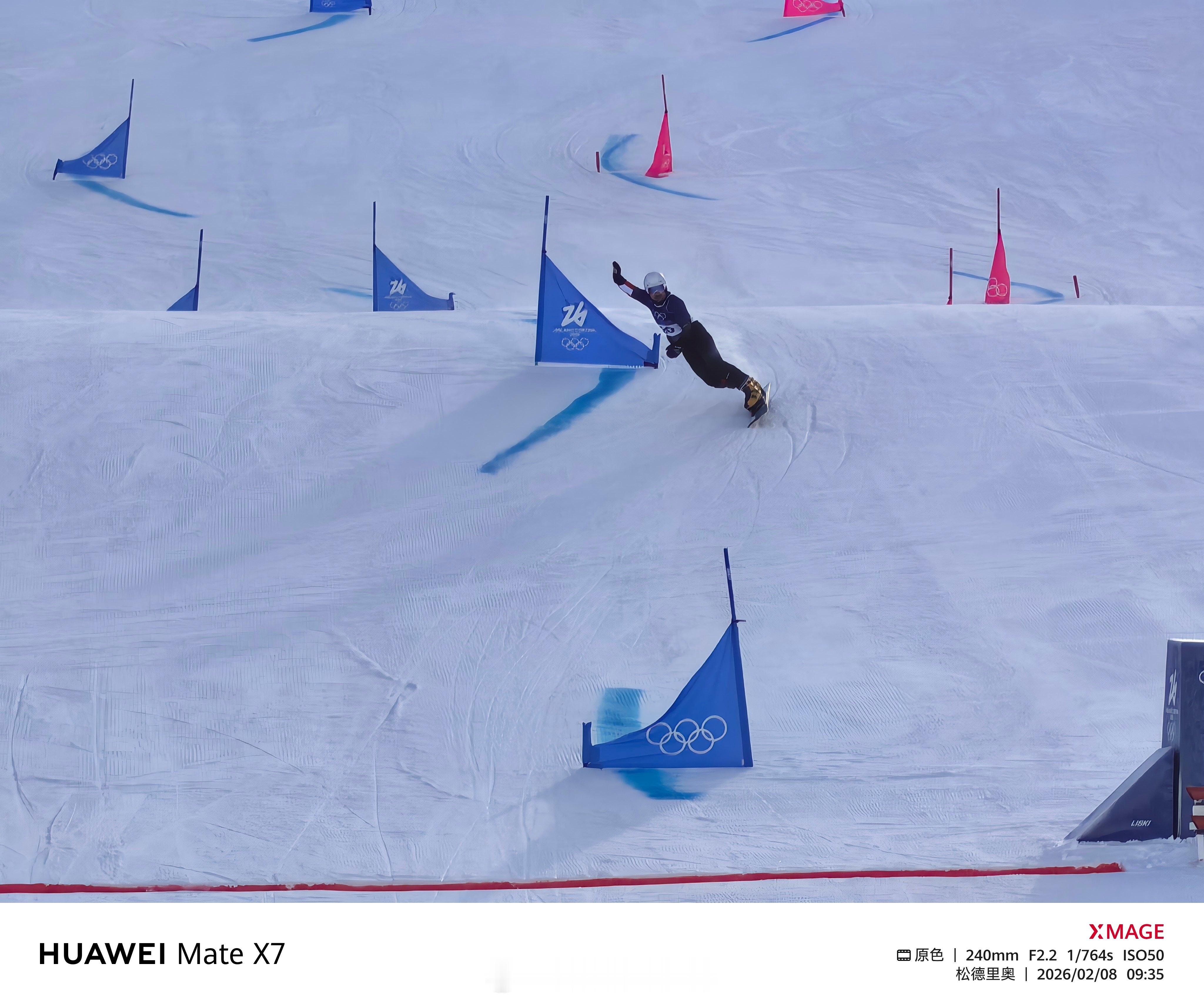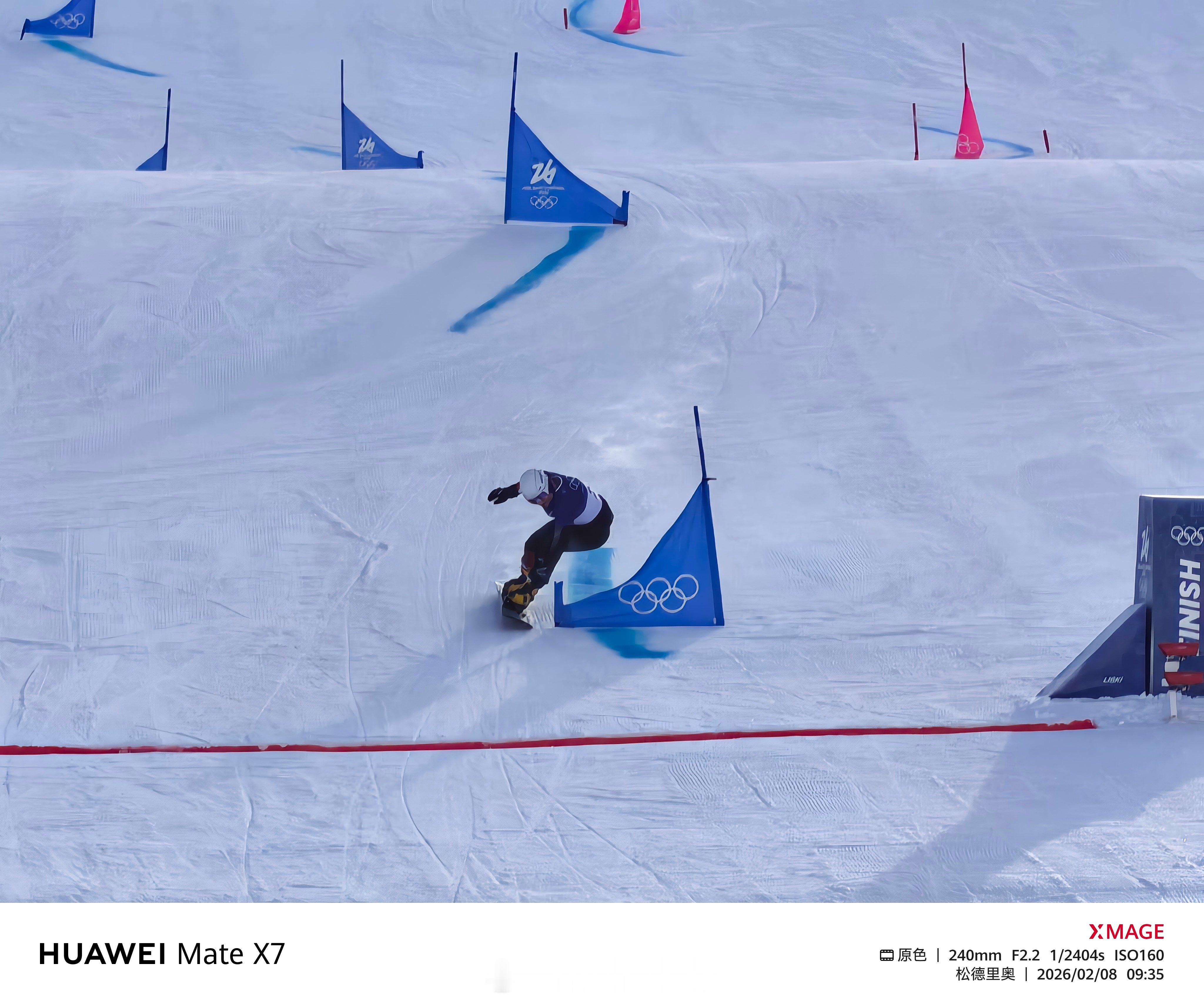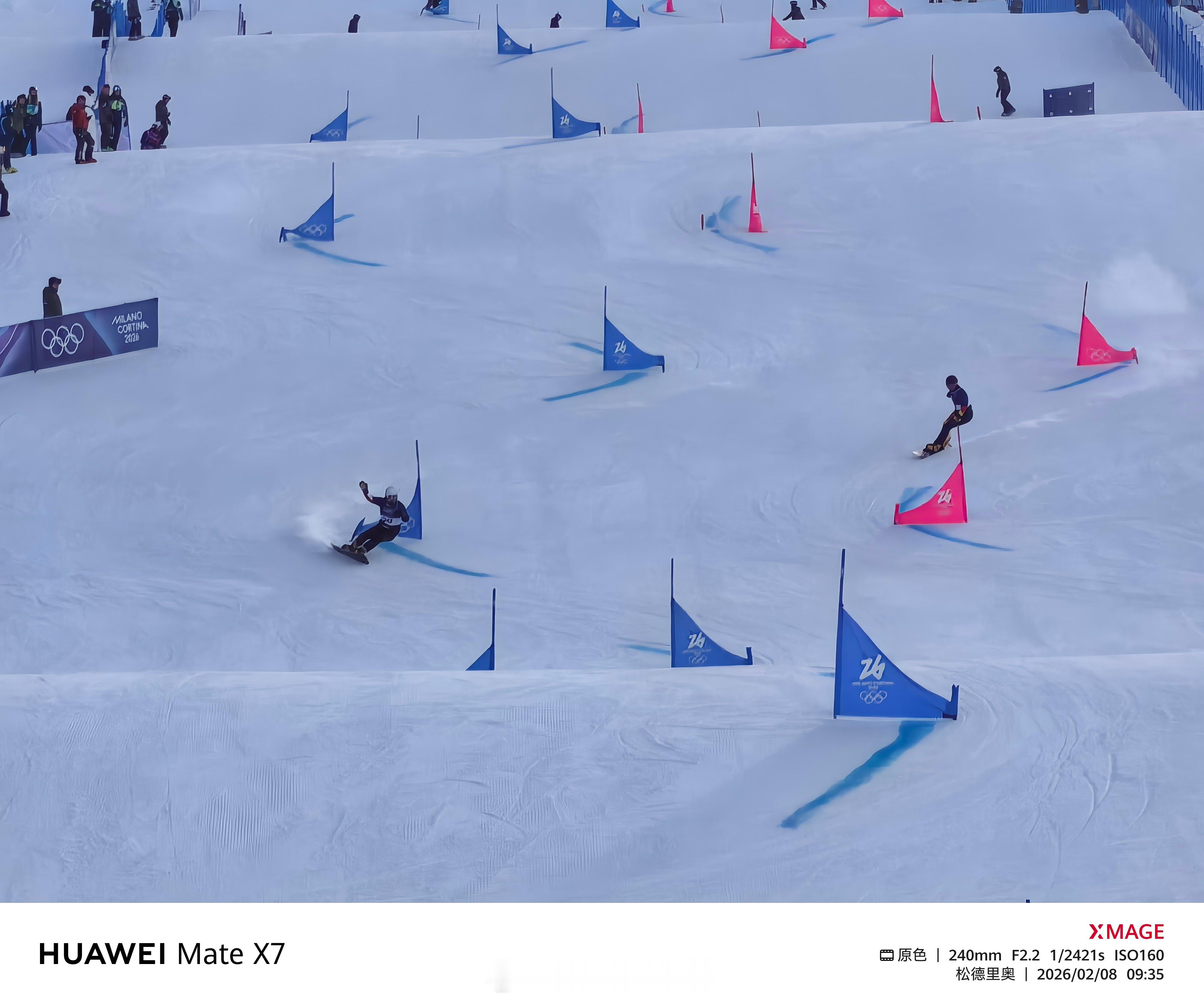 米兰冬奥会今天带来的是单板滑雪平行大回转资格赛的现场图,今儿带了华为Mate X7,这么远的距离高速抓拍下,10倍长焦也是稳稳的出片!冬奥加油