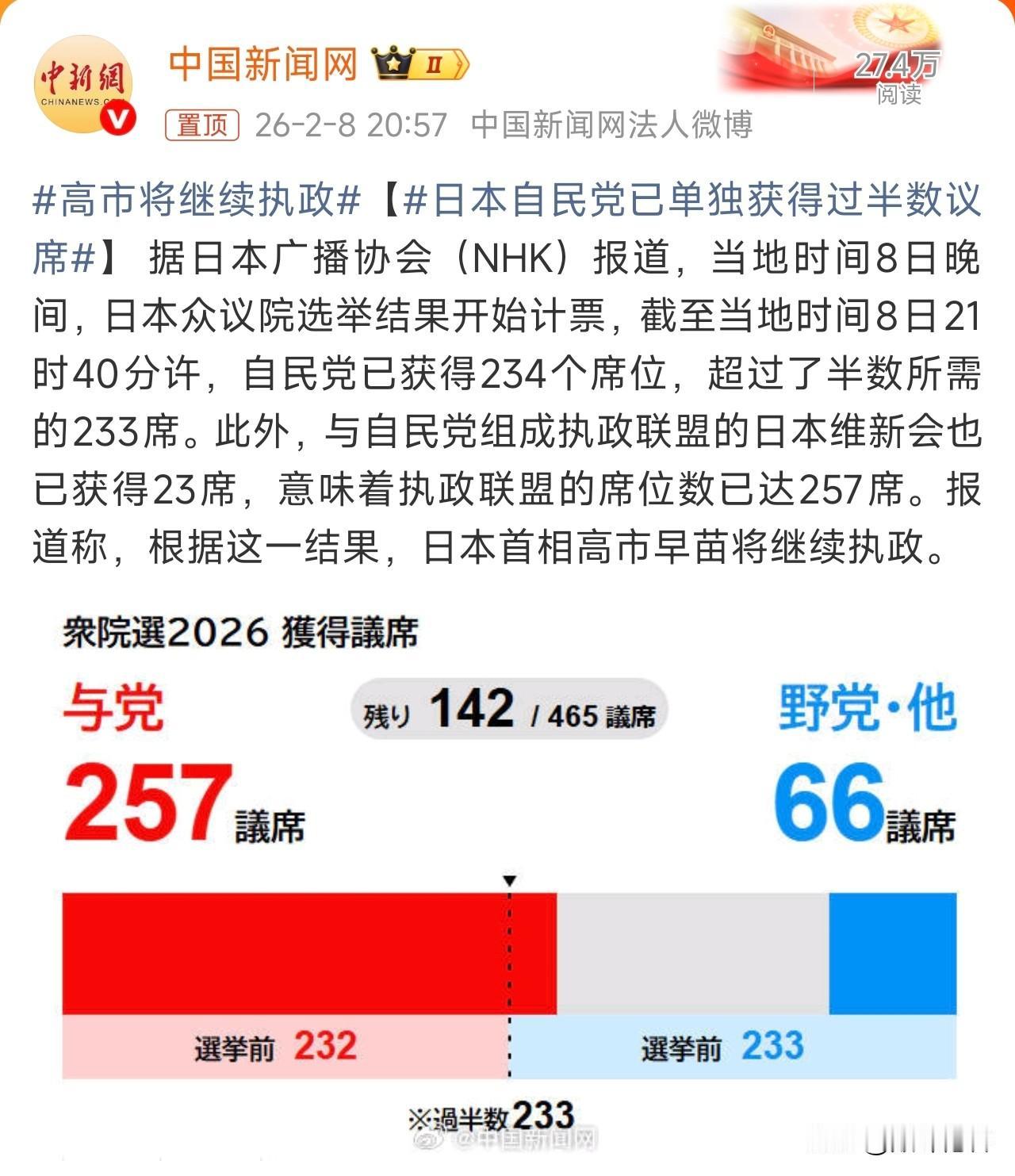 高市将继续执政,说明日本的社会已经发生了改变,集体向右转,集体开始膨胀了。这也说明,日本要在扩张军备的道路上一路狂奔,永不回头了。 东北亚从此不再安定,我们要时刻警惕日本军国主义的泛滥,已经不是复活的问题了。看来,就算我们想和平崛起,也并不完全取决于我们自己了,那我们就时刻准备着,为打赢战争做好一切准备!