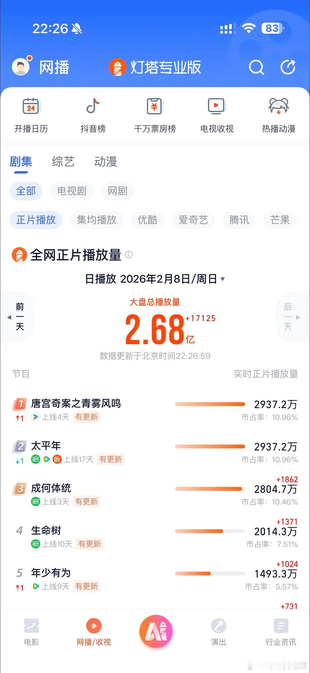 唐宫奇案灯塔第一了,目前来看破万速度是第五!主要是优酷的日活还是蛮低的,这能直接