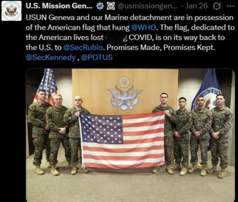 活久见!美国正式退出世界卫生组织后,世卫组织拒绝降下并归还悬挂在其门前的美国国旗,要求美国补交齐所欠的会费后才能归还。于是美国派出在瑞士的海军陆战队士兵直接去现场夺回了这面美国国旗。 事后美国驻联合国大使、驻日内瓦世卫办事处还大大方方证实消息,一点不觉得羞耻,反而摆出一副“我有理”的架势 可以说这次退世卫、抢国旗,不过是美国“赖账霸权”的升级版,从经济赖账,直接升级成武力霸凌。 美国这次退出世卫,可不是临时起意,是特朗普在2025年1月刚上任,就急急忙忙签署了退出世卫组织的行政命令,按照世卫组织的章程,成员国要退群,得提前一年通知,所以直到2026年1月22日,美国才正式退出世卫组织。 而世卫组织之所以不让降旗、不归还国旗,核心就是美国欠着钱没还。说白了就是按规矩办事,世卫组织发言人早就明确说过,美国有权退出,但必须先缴清拖欠的会费,不然就不能算真正完成退群流程,国旗自然也不能随便归还。据统计,美国这两年一直拖着世卫的会费没交,2024年和2025年两年的欠款加起来,差不多有两亿六七千万美元,可不是一笔小数目。 世卫总部在瑞士日内瓦,美国也没绕弯子,直接派出驻扎在瑞士的海军陆战队士兵,直奔世卫总部门口,目标就是那面美国国旗。当时现场还有世卫组织的工作人员试图阻拦,跟士兵解释说,只要补交了会费,马上就把国旗归还,不用这么兴师动众,但这些士兵根本不听,也不跟工作人员废话,上去就把悬挂着的美国国旗扯了下来,揣着就走,全程强硬又蛮横,完全没把世卫组织的规矩放在眼里,更没顾及任何国际体面。 这事刚过去没两天,美国驻联合国大使和驻日内瓦世卫办事处的人,就大大方方站出来证实了这件事,没有丝毫遮掩,更没有半点羞耻感。他们接受询问的时候,还特意摆出来一副“我有理”的架势,找各种借口辩解,说世卫组织用国旗要挟美国补交会费,做法不合理,还吐槽世卫组织故意刁难美国,完全不提自己拖欠会费、违反规矩的事,反倒把自己塑造成了“受害者”,简直是颠倒黑白、刷新下限。 其实这也不是美国第一次干这种赖账耍无赖的事了,这次退世卫、抢国旗,只不过是它“赖账霸权”的升级而已,以前还只是偷偷摸摸经济赖账,现在直接升级成了武力霸凌。大家可能不知道,美国不光拖欠世卫组织的会费,联合国它也欠着一大笔钱,足足有三十多亿美元,拖了好几年,联合国秘书长多次警告,说因为成员国拖欠会费,联合国都快面临财政崩溃的风险,可美国依旧不当回事,催了多少次都无动于衷。 就连联合国教科文组织,美国也欠着超过六亿美元的预算,而且这已经是它第三次宣布退出联合国教科文组织了,退群之前还不忘欠一笔会费,简直是把“赖账+退群”玩成了自己的专属套路。更离谱的是,它还拖欠世界反兴奋剂机构的会费,最后因为一直不补交,直接丧失了执委资格,就算这样,它也没觉得有什么不妥,依旧我行我素。 很多人可能会疑惑,美国作为全球头号经济强国,怎么会缺这点会费钱?其实根本不是缺,而是故意不想交。它一年的军费开支就有七千多亿美元,拖欠的这点会费,连它军费的零头都不到。说白了,美国就是把缴纳会费当成了一种外交杠杆,哪个国际组织听它的、顺着它的意思来,它就按时交费;要是哪个国际组织不配合它、不按照它的要求办事,它就故意拖着会费不缴,以此来施压、要挟,逼对方妥协。除此之外,美国国内的党派斗争,也让会费成了双方博弈的筹码。 这次美国抢国旗的事,也引来了不少国家的私下吐槽,大家都觉得美国太霸道、太无赖,一点大国该有的样子都没有。联合国秘书长古特雷斯早就发出过警告,说成员国长期拖欠会费,已经严重制约了联合国的正常运转,甚至关闭了部分员工入口来节省开支;世卫组织也表示,会在2月初召开执行委员会会议,专门讨论美国退出事宜和拖欠会费的处理方式,但估计也很难有实质性的结果,毕竟美国向来无视国际规则,根本不会轻易妥协。 说到底,美国这次退世卫、抢国旗,本质上就是霸权主义的赤裸裸体现,它觉得自己是全球老大,就可以为所欲为,无视所有国际规则,想退群就退群,想赖账就赖账,想动武力就动武力。可它忘了,国际社会讲究的是公平公正、互利共赢,不是谁拳头硬谁说了算,也不是谁霸道谁就能一直横行。长期这样耍无赖、搞霸权,只会慢慢消耗自己的软实力,让越来越多的国家看清它的真面目,慢慢远离它,到最后,亏的终究是美国自己。毕竟,耍无赖或许能得意一时,但绝对走不远。