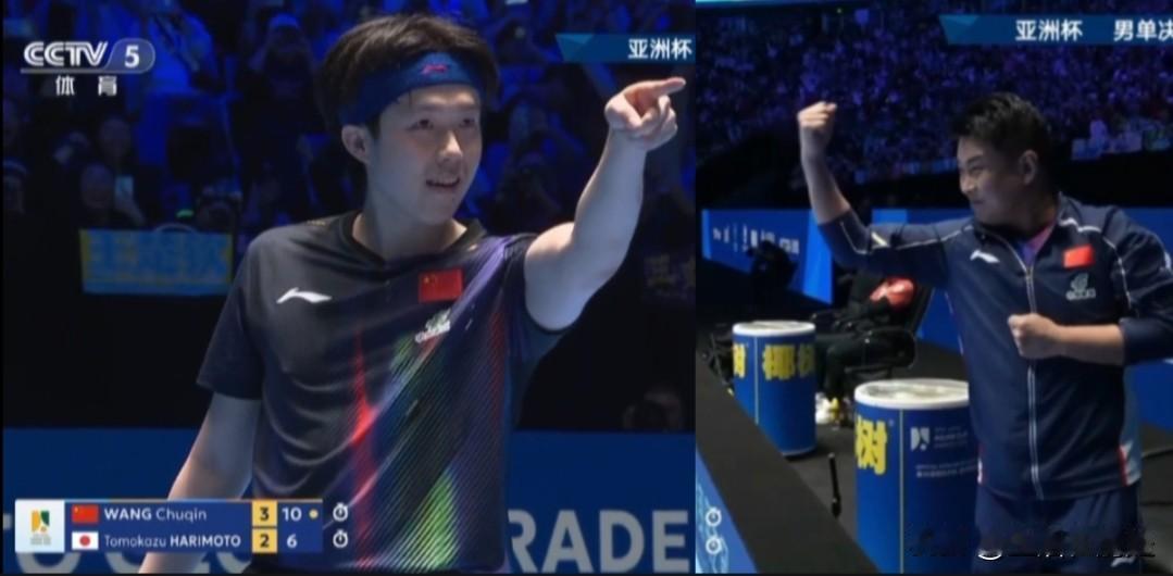 王楚钦这一指,谁懂? 在4:2战胜张本智和蝉联乒乓球亚洲杯男单冠军后,王楚钦改变了以往的庆祝方式,用手指指向了教练席王皓,而王皓也紧攒拳头挥动回应。 这师徒的互动庆祝意味深长呀! 今天的决赛,王皓和王楚钦应该是作了精心的针对部署,考虑到各种情况的应对。 在先丢一局情况下,第二局领先后,张本智和一度将比分并上,关键时候王楚钦心领神会了王皓的技术暂停,回来后连得2分拿下这一句。 接下来的比赛,张本智和虽然又拿下一局,但王楚钦掌控了比赛。尤其是第6局,最后几个球直接把张本智和打懵了,让其兵败如山倒一样败下阵。