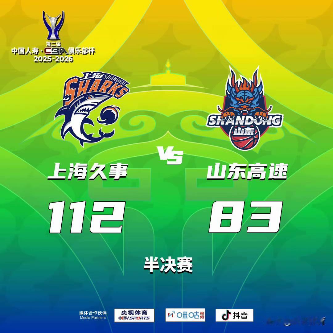 CBA俱乐部杯:上海男篮大胜山东,强势挺进决赛 2026年2月8日晚,CBA俱乐部杯半决赛精彩纷呈!上海久事男篮以112 - 83的大比分狂胜山东高速男篮,成功闯入决赛,这也是他们连续第二年跻身决赛。 比赛伊始,山东队迅速进入状态,打出了7 - 0的完美开局。然而,上海队叫了暂停进行调整,凭借内线优势在首节末实现反超。第二节,山东队虽努力将分差缩小,但未能实现反超。 第三节成为比赛的转折点。山东队刚把分差缩小至2分,上海队外援弗格突然爆发,单节砍下20分,几乎与山东队全队单节得分相当,一举奠定了胜局。此外,上海队的洛夫顿、怀特塞德、王哲林也有出色发挥。 接下来,上海队将静待广厦与山西之战的胜者,向冠军发起冲击,让我们一同期待!