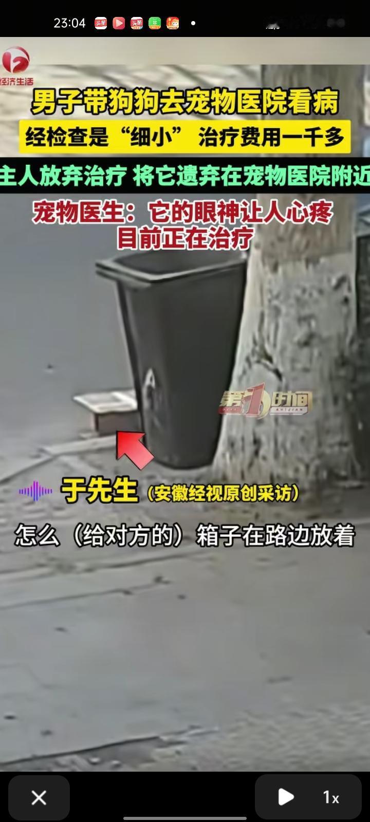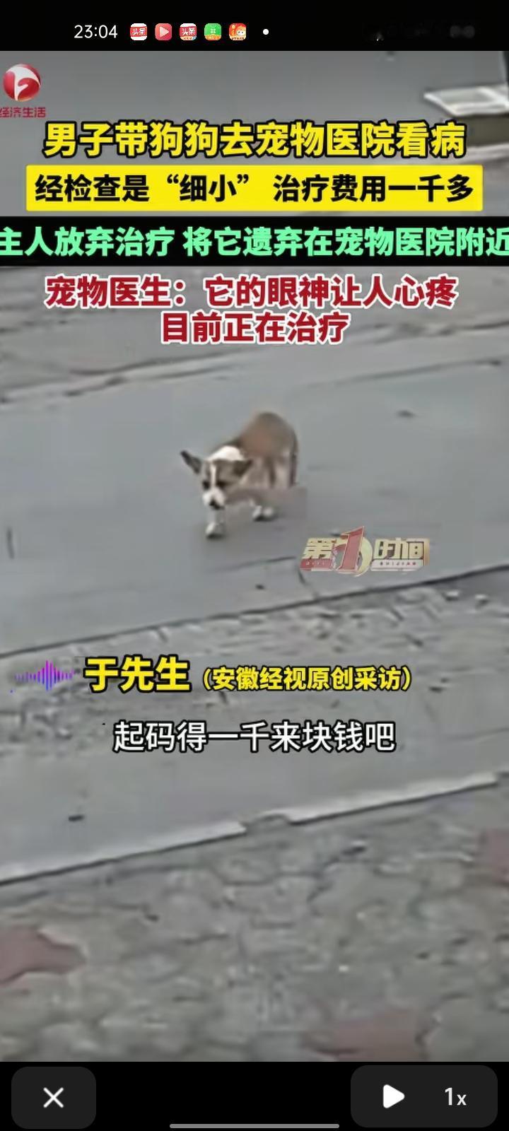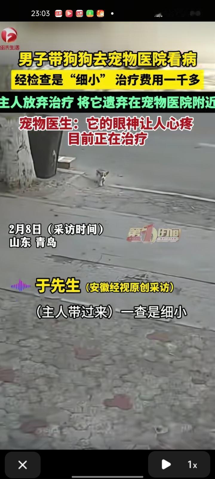 2月7日,青岛平度市。主人带狗狗去宠物医院看病,经医生检查是狗的第二传染病——细小,治疗费用一千多,主人听了这话就放弃治疗了,把它遗弃在宠物医院附近。医生看着狗狗的眼神满是心疼,大冷天不能见死不救,就把它拿到医院治疗,目前正在治疗