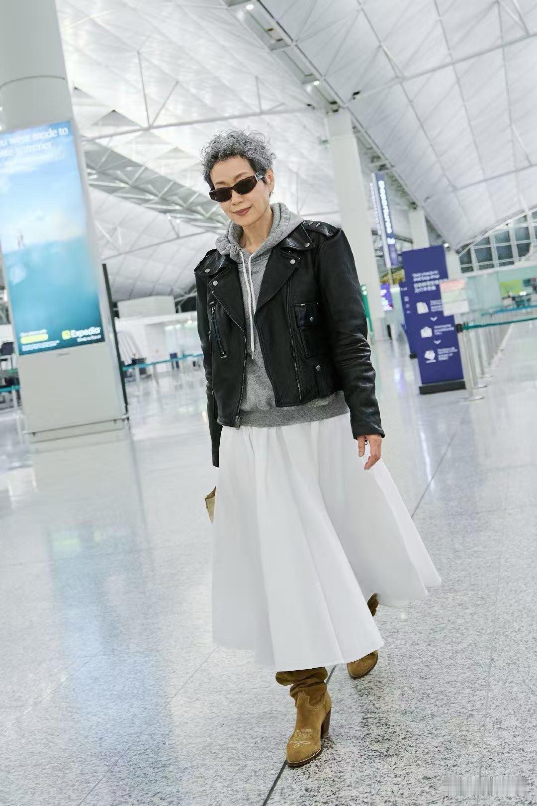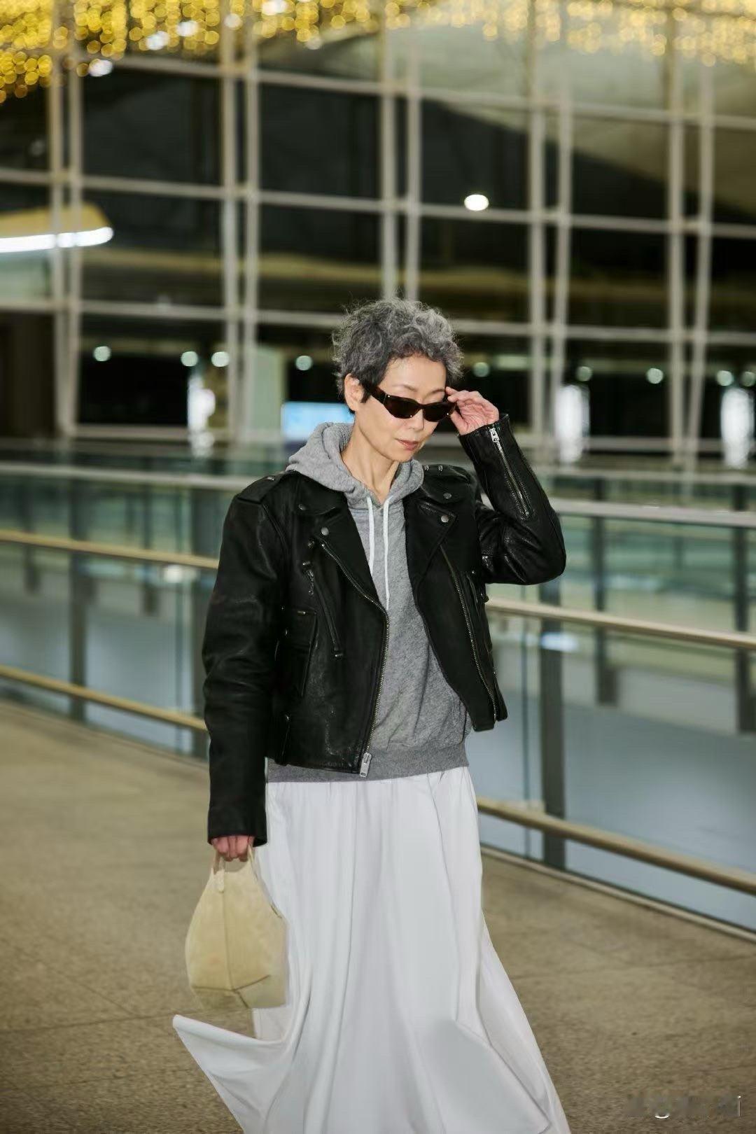 真的被叶童的老年穿搭狠狠惊艳!黑色皮衣叠搭灰色卫衣,再配上小白裙,时髦减龄还自带高级感,气质绝了。