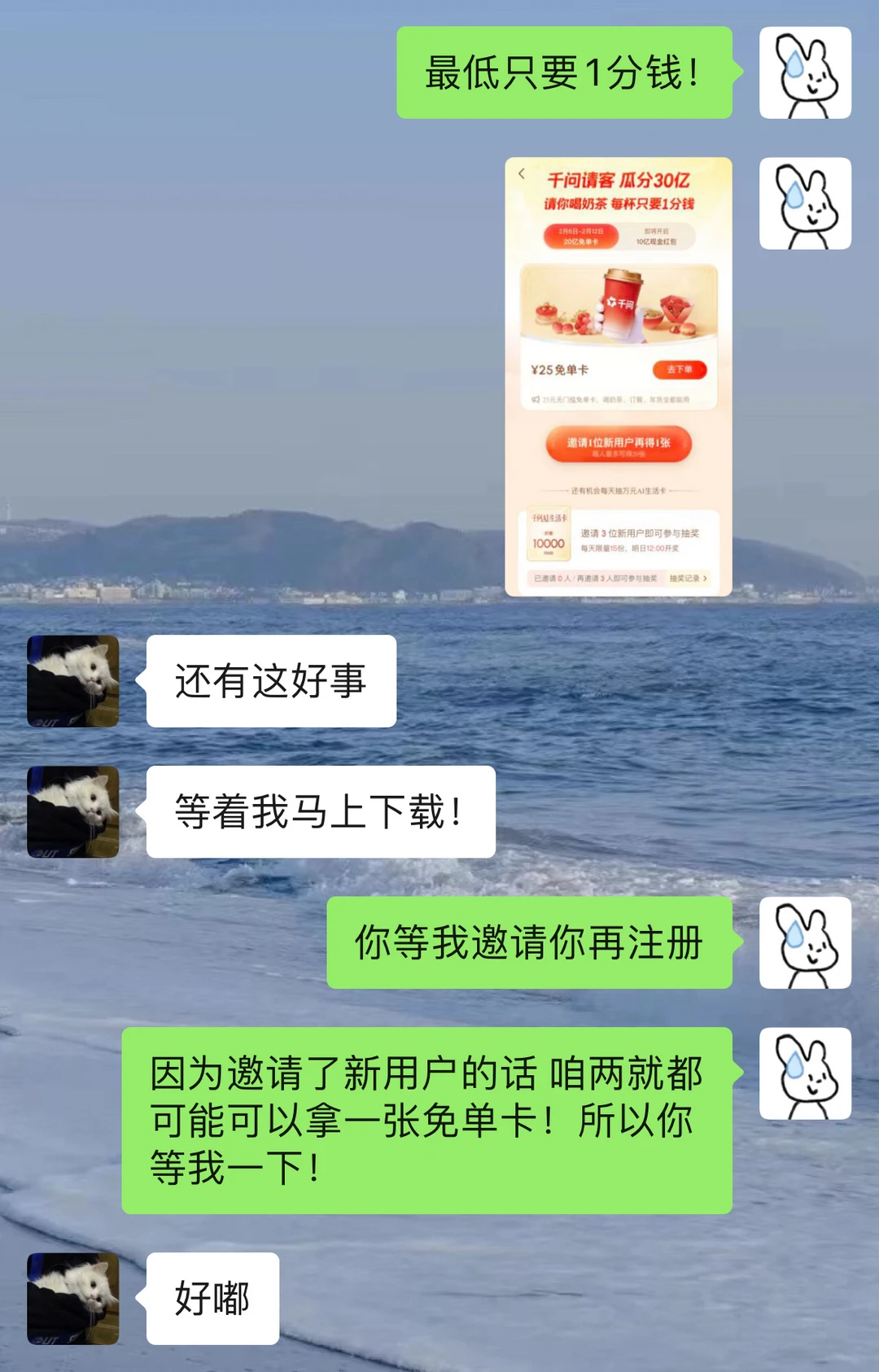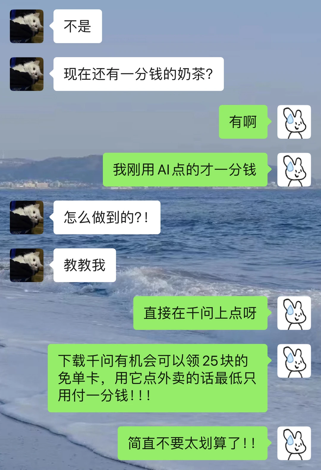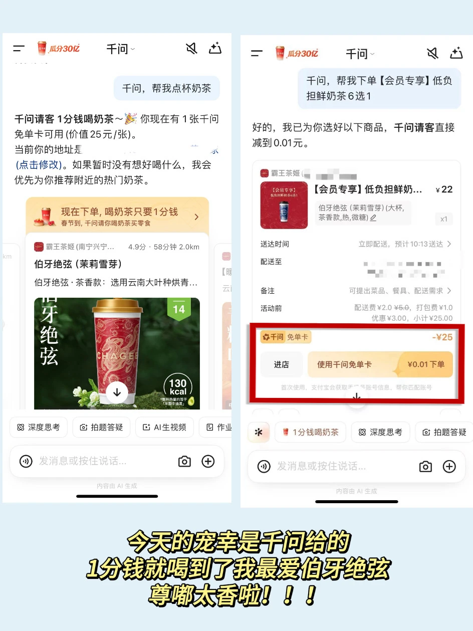 谈恋爱不玩抽象那玩什么 偷偷背梗 做有梗女人 小小男友 轻松拿捏哈哈哈哈哈 每次和男朋友斗嘴完之后 我真的一点儿都不生气 因为我会点杯奶茶哄好我自己 毕竟没有人比我更爱你 老几!! 今天我还用了1分钱就喝到了我最爱的伯牙绝弦 因为现在下载千问App就有机会领25元的外卖免单卡 用它来点外卖最低只要0.01元!四舍五入就是不花钱阿! 如果是能邀请到新用户的话 两个人还可能各得一张外卖免单卡 ! 用它来点小烧烤、点咖啡什么的各种外卖都可以,简直不要太香了!! 姐妹们也快去薅起来!!