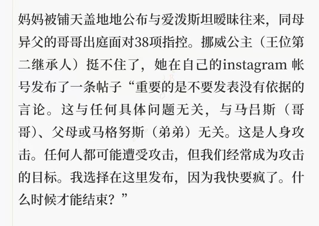 上梁不正下梁歪。挪威王储妃的女儿公开支持她的母亲跟他的同母异父哥哥。 看来遗传基因真的很重要。 这是她在社交账号发的帖。她的母亲劣迹斑斑,她的哥哥犯了无数罪行,而她是挪威未来女王。就算她的母亲被离婚,她的王位继承也不会改变。 挪威能接受这种三观不正的女王吗?这种三观不正的女王,可以当吉祥物,代表国家吗?