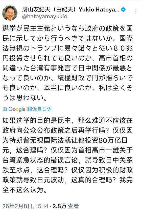 就在刚刚 日本前首相鸠山由纪夫今天(2月8日): “如果选举真的是民主的体现,难道不应该在向国民明确政府政策之后再进行吗?我们真的可以默许政府在无视国际法的特朗普面前唯命是从,白白投入80万亿日元吗? 真的能接受高市首相在台湾问题上的错误言论,让日中关系恶化到谷底吗?真的可以任由积极财政政策导致日元汇率动荡不安吗?真的可以吗?我绝不这么认为。” 先说最核心的一条:选举到底为了什么?现代民主的基本逻辑很简单:政策公开、利弊讲清、民众选择、政府负责。可如今日本政坛,越来越像一场赶时间、避关键、藏代价的仓促表演。 重大国策不解释、巨额预算不透明、外交风险不预警,只靠渲染威胁、制造对立、煽动情绪来推动选举。 鸠山由纪夫看得最透:不把政策说清楚,就急着投票,那不是民主,是敷衍民意。不把代价摊开讲,就强行推进,那不是治国,是逃避责任。当一个国家的重大选择,被藏着掖着、被赶着推进,受伤的永远是普通民众。 比选举形式化更危险的,是日本外交正在失去自我。面对强调 “美国优先”、习惯单边行动、常常无视国际规则的外部压力,日本政府的选择不是保持独立判断,不是坚守国际法底线,而是一路顺从、一路配合、一路加码投入。 高达 80 万亿日元的巨额投入,背后是什么?是防务开支的急剧膨胀。是对外部军事依赖的不断加深。是把国民辛辛苦苦积累的财富,大量投向充满不确定性的地缘博弈。 这笔钱没有凭空消失。它来自税收,来自国债,来自每一个日本人的未来。可政策到底是什么?风险在哪里?对日本安全究竟是增强,还是把国家拖进更深的漩涡?政府没有给出清晰答案,更没有充分讨论。 鸠山由纪夫直接点破:对无视国际法的力量唯命是从,不是安全,是自我捆绑。不计后果砸下巨资,不是战略,是被动买单。一个真正成熟的国家,不会把命运完全绑在别人的战车上,更不会用举国财富,去赌一场别人设计的棋局。 而最敏感、最危险、最容易引爆地区局势的,就是台湾问题。 台湾问题是中国内政,是国际社会公认的事实,也是中日关系正常化最根本的政治前提。中日之间四个政治文件,写得清清楚楚:日本坚持一个中国原则。这不是选择,是承诺;不是偏好,是底线。 可近年来,日本内部一些人不断越线。不断发表错误言论,不断渲染所谓 “威胁”,不断把台湾问题与日本安全强行捆绑。高市早苗的相关表态,正是这种危险倾向的集中体现。 一句话,就能把日中关系拖到谷底。一句话,就能让地区稳定蒙上阴影。一句话,就能让几十年的和平交流成果,面临被轻易摧毁的风险。 鸠山由纪夫看得非常明白:在台湾问题上玩火,不是强硬,是鲁莽。不是爱国,是拿国家命运冒险。不是外交智慧,是被极端情绪和外部压力牵着走的短视。 中日关系一坏,最先受伤的是谁?是日本的出口企业。是依赖中国市场的制造业。是旅游业、服务业、农业、水产业。是千千万万普通日本家庭的工作、收入、生活成本。 政客一句话,民众承担所有代价。这就是鸠山由纪夫最不能接受的地方。 再往下看,国内的经济与民生,同样被拖入动荡。 日本长期推行超宽松货币与积极财政,债务规模早已高居发达国家前列。在本就脆弱的财政基础上,继续大规模扩张、继续大幅增加防卫相关开支,带来的直接后果,就是汇率不稳、日元波动、进口物价上涨、生活成本走高。 普通人最直观的感受就是:东西更贵了。钱更不值钱了。工作更不稳定了。未来更看不清了。 政府总说,这是为了安全,为了国家利益。可鸠山由纪夫反问:安全的最终目的,不就是让国民安稳生活吗?如果安全政策,反而让经济更乱、民生更难、汇率更晃,那这种安全,意义何在? 当外交越来越激进、财政越来越激进、言论越来越激进,最终承受压力的,不是发表强硬讲话的政客,而是每天要付账单、要养孩子、要养老的普通人。 这就是鸠山由纪夫整篇发言最扎心、也最真实的逻辑:国家的方向错了,再多强硬口号,都掩盖不住现实的隐痛。 今天的日本政坛,有一种很奇怪的氛围。谁越对美顺从,谁越被看作可靠。谁越对华强硬,谁越容易获得舆论声量,谁越主张扩军、越主张冒险,谁越容易被包装成 “爱国者”,重视日中关系、重视国际法、重视民生优先的人,反而显得不合时宜。 鸠山由纪夫的发言,之所以震动日本,不是因为他语气激烈,而是因为他讲了所有人都懂、却很少有人敢公开说的大实话。