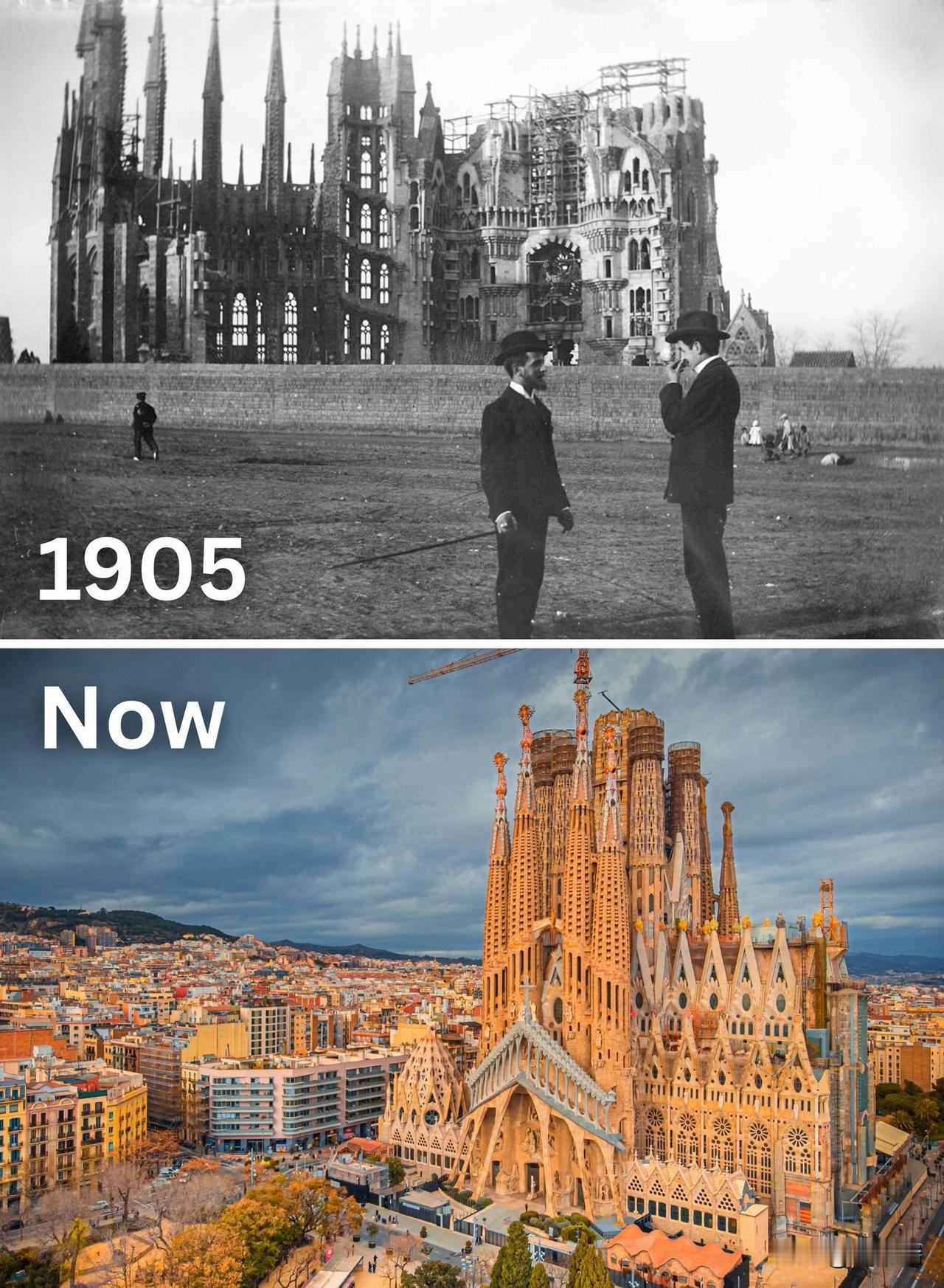 圣家堂(Sagrada Familia)的百年变迁展示了其从一片空旷土地上的早期建筑工地发展成为巴塞罗那标志性建筑的惊人历程。 建设历程 始建与早期: 圣家堂的建造始于1882年。1883年,著名建筑师安东尼·高第(Antoni Gaudí)接手该项目,并彻底改变了设计。 高第去世与延误: 1926年高第去世时,教堂仅完成了约四分之一。此后,工程经历了资金短缺、1936年西班牙内战期间建筑模型被砸碎和草图被烧毁等多次延误和破坏。 持续建造: 多代建筑师和团队努力拼凑修复留下的碎片,并继续施工。 现代进展: 随着时间的推移,施工技术和材料不断演变,例如引入了3D打印技术。 预计完工: 圣家堂的主体建筑预计将于2026年(高第逝世一百周年)正式落成。届时,高达172.5米的耶稣塔将成为世界上最高的教堂建筑。 建筑特色 圣家堂拥有东、西、南三个立面,分别是“诞生立面”、“受难立面”和“荣耀立面”。 高第的设计灵感来自大自然,教堂内部的Y型立柱如同森林中的树枝向天顶伸展。 教堂使用了绚丽的彩色玻璃窗,光线透过玻璃照射进来,营造出独特的氛围。 这张图片生动地展示了圣家堂从1905年简朴的建筑工地到如今宏伟壮观的城市地标的巨大变迁。