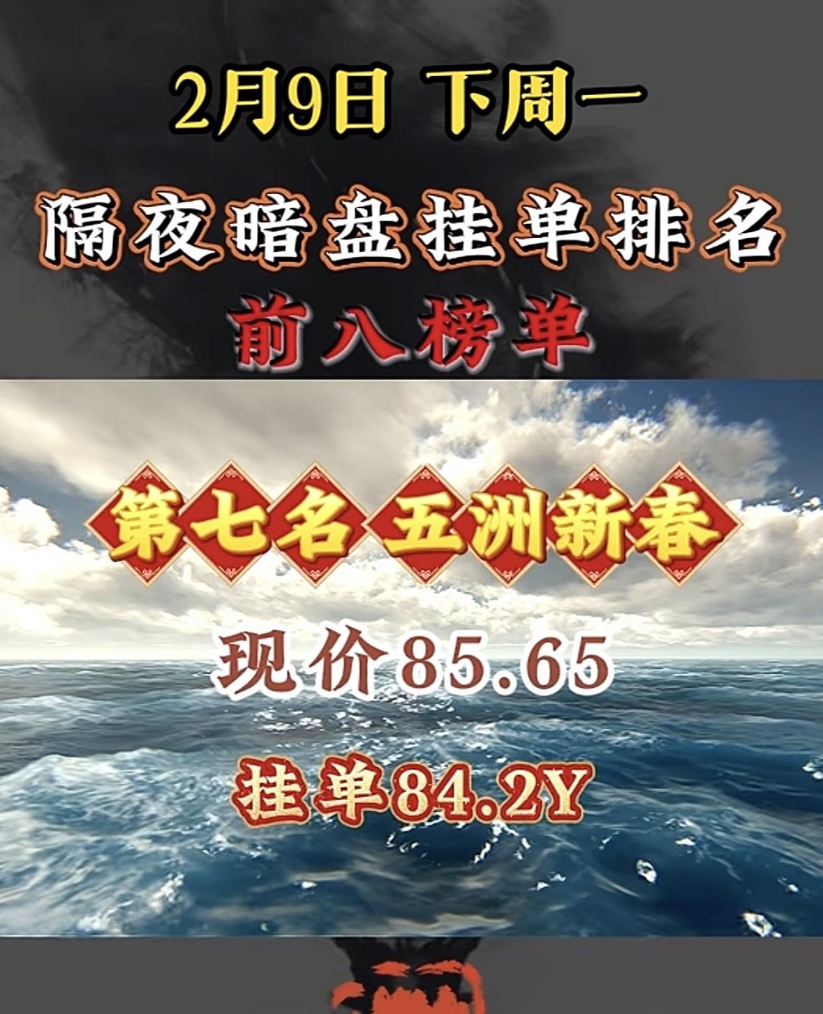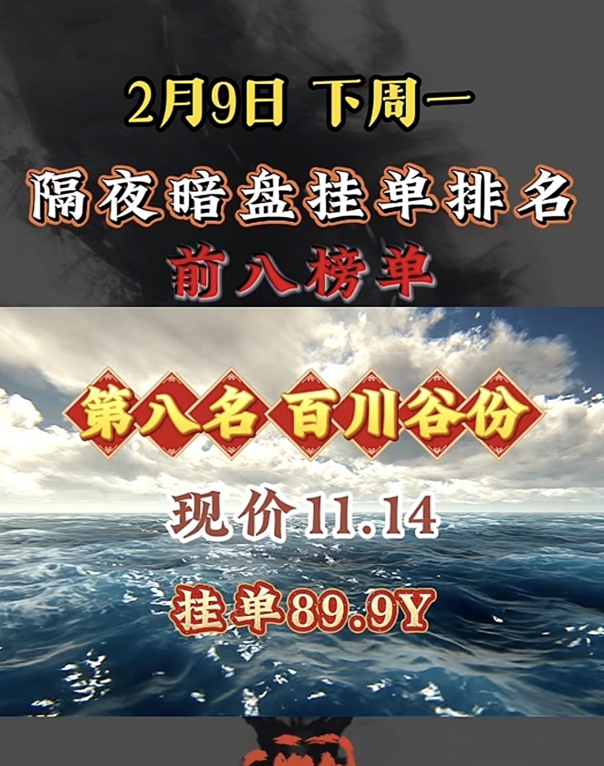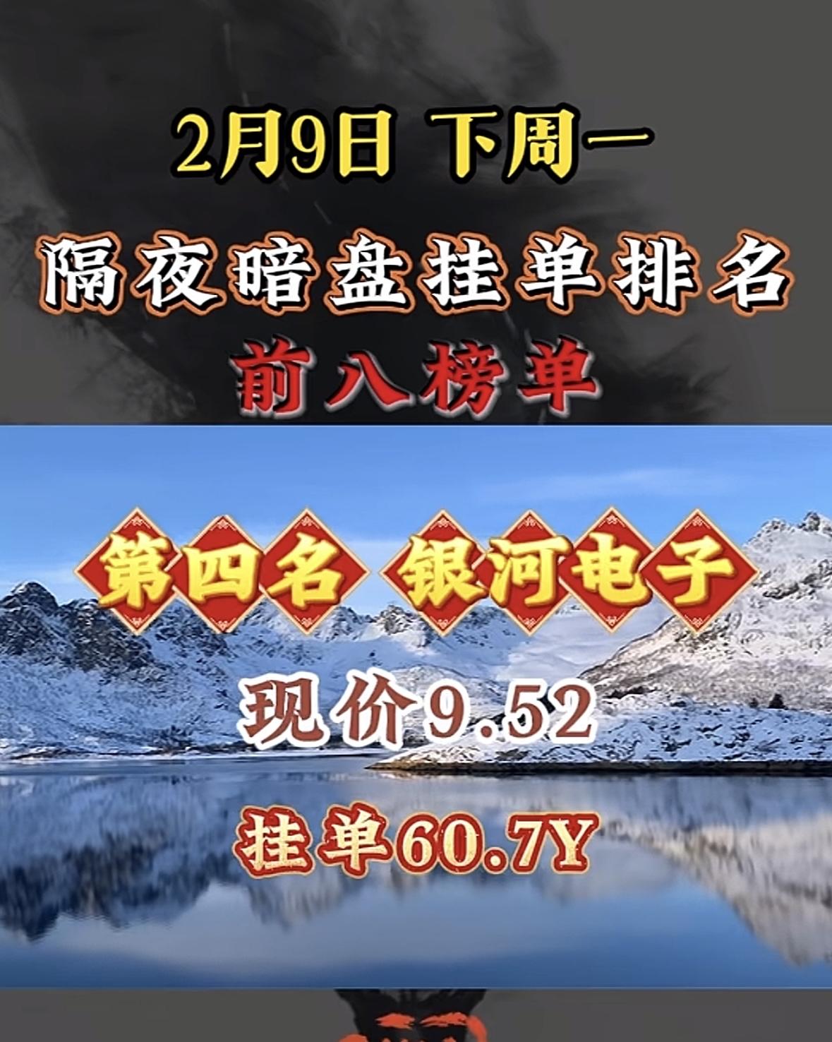 2月9日暗盘隔夜挂单排名很有看头。百川谷股份现价11.14,挂单竟达89.9Y,这数字相当惊人,看来不少人盯上它了。 再瞧瞧当天排名前八的,第一位协鑫集成,现价4.58,挂单69.56亿;第二位白银有色,现价9.60,挂单66.15亿。和2月6日比,变化不小,像平潭发展,6日挂单48.92亿,9日是48.36亿。这暗盘隔夜挂单的情况时刻在变,投资的朋友可得多留意,说不定这里面藏着不少赚钱的机会呢。