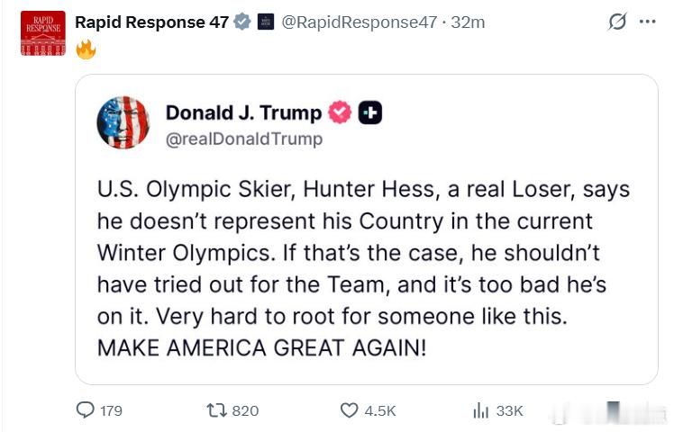 美国奥运滑雪运动员亨特·赫斯,一个真正的失败者,说他在现在的冬季奥运会上不代表他的国家。如果真是这样的话,他就不应该去参加国家队的选拔,太可惜他居然还进了队。很难为这种人加油打气。