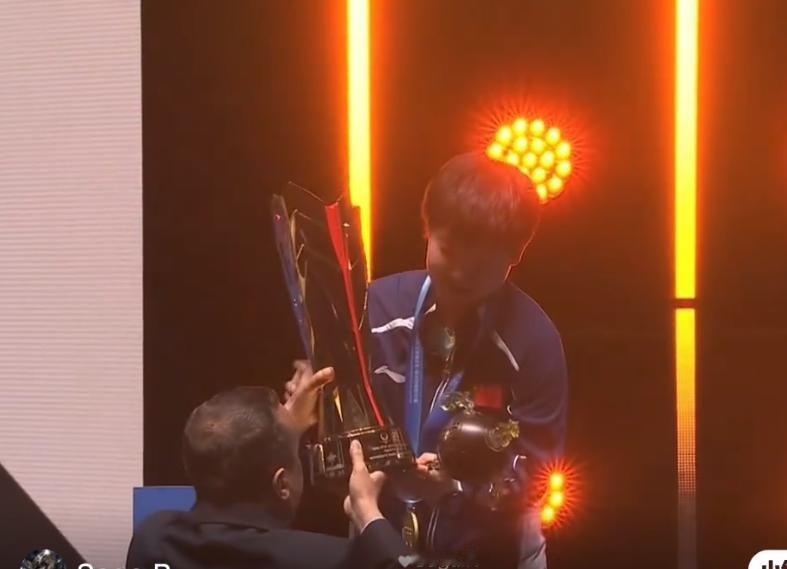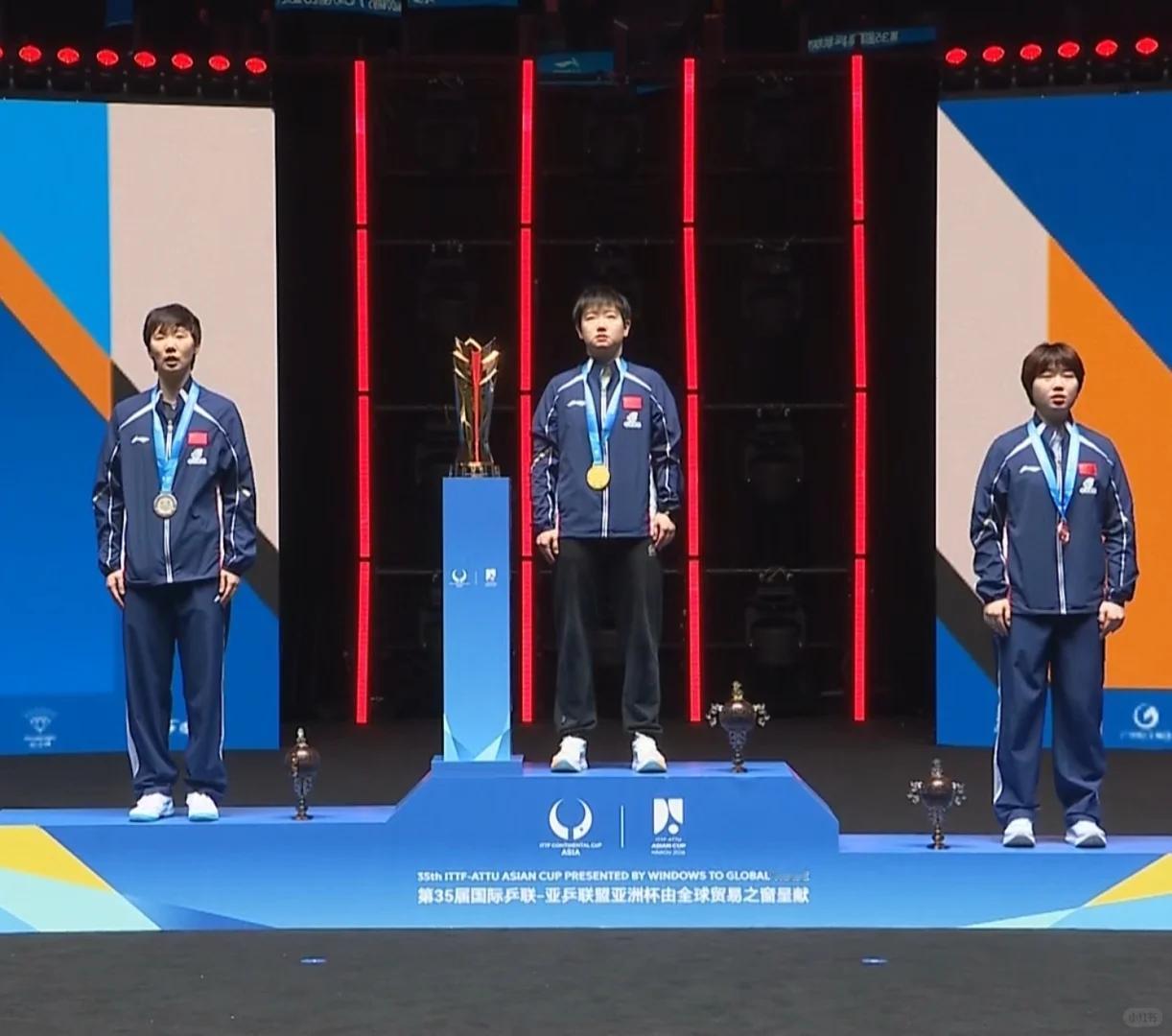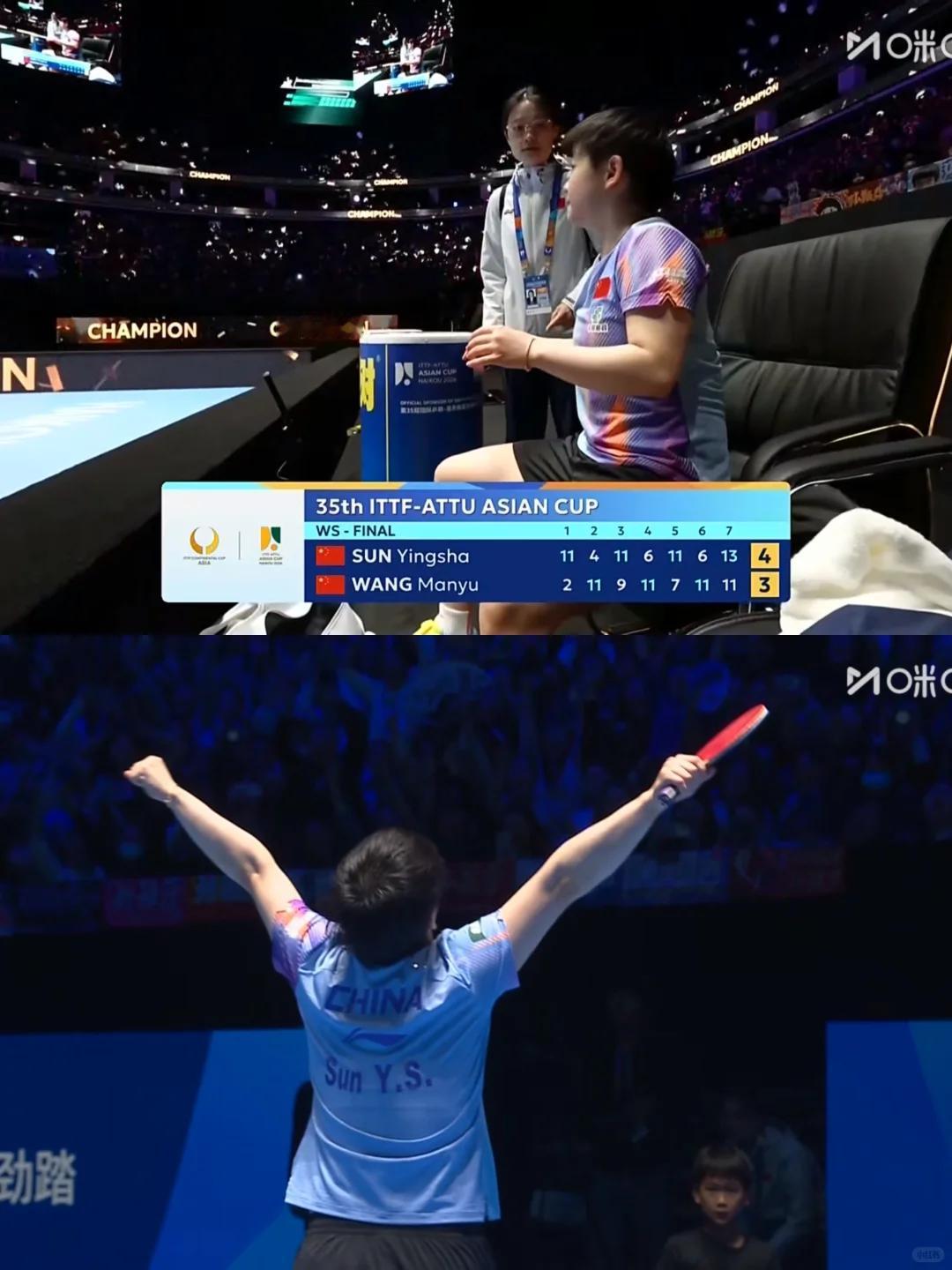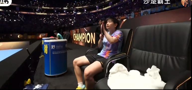 国乒男队都在看莎莎和曼昱的决胜局。 恭喜莎莎夺得亚洲杯女单冠军,两个人都很棒,决胜局莎莎是以2分的优势赢了王曼昱,成为今年亚洲杯女单冠军。在决胜局的时候,看到男队也不训练了,当两个人比分来到10平时,王楚钦点点头离场了,他也要去准备自己的男单决赛了。确实两个人打了七局,打了一个半小时多,两个人都累了。 时隔一个多月,莎莎因为脚伤没有参加比赛,重回赛场后她也找到了自己最好的竞技状态,新年的第一个冠军拿到了,这个小小的女孩,身上有大大的能量。决赛局确实打的很紧张,在8:7之后的那个擦边球,裁判说是擦的侧边,那一分不算,两个人从8:8开始一直打到11平,最终莎莎是以13-11拿下决胜局,夺冠后的莎莎也是高举双手,让自己释放了一下。 今天这比赛拖的时间有点长,女单颁奖仪式结束后男单比赛才开始,估计王楚钦和张本智和打完比赛就十点半左右了。还是恭喜莎莎、王曼昱、蒯曼,她们三个一起站在了领奖台,这个奖杯很好看呢,看到莎莎笑了,休息过后确实状态不一样了。