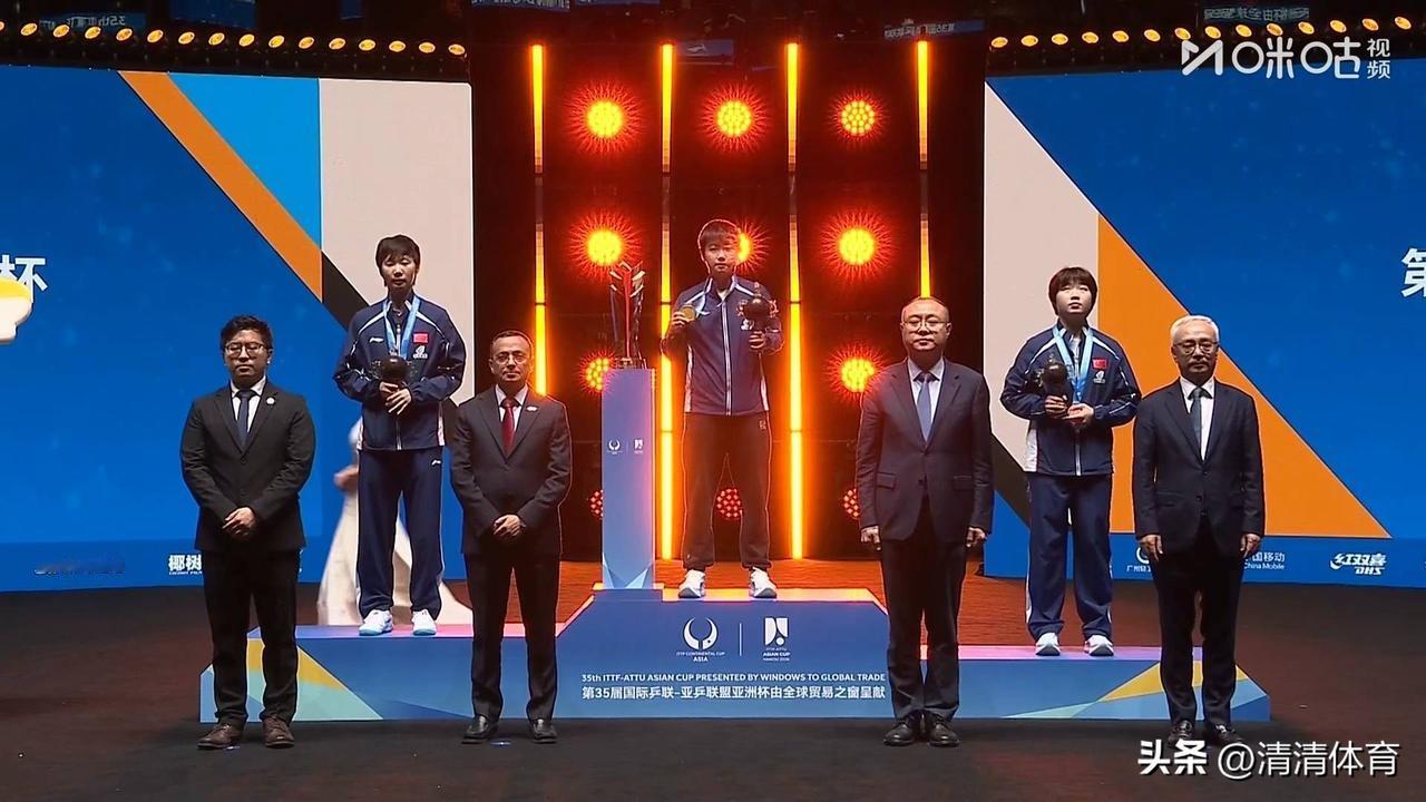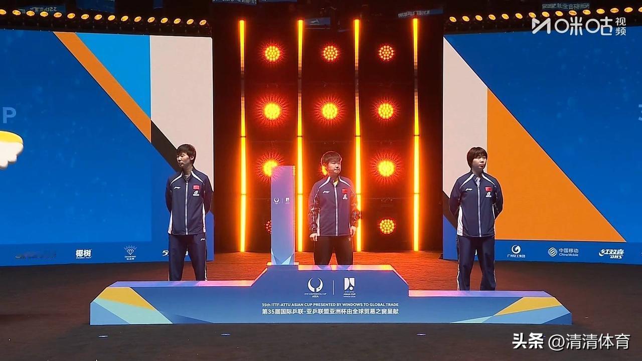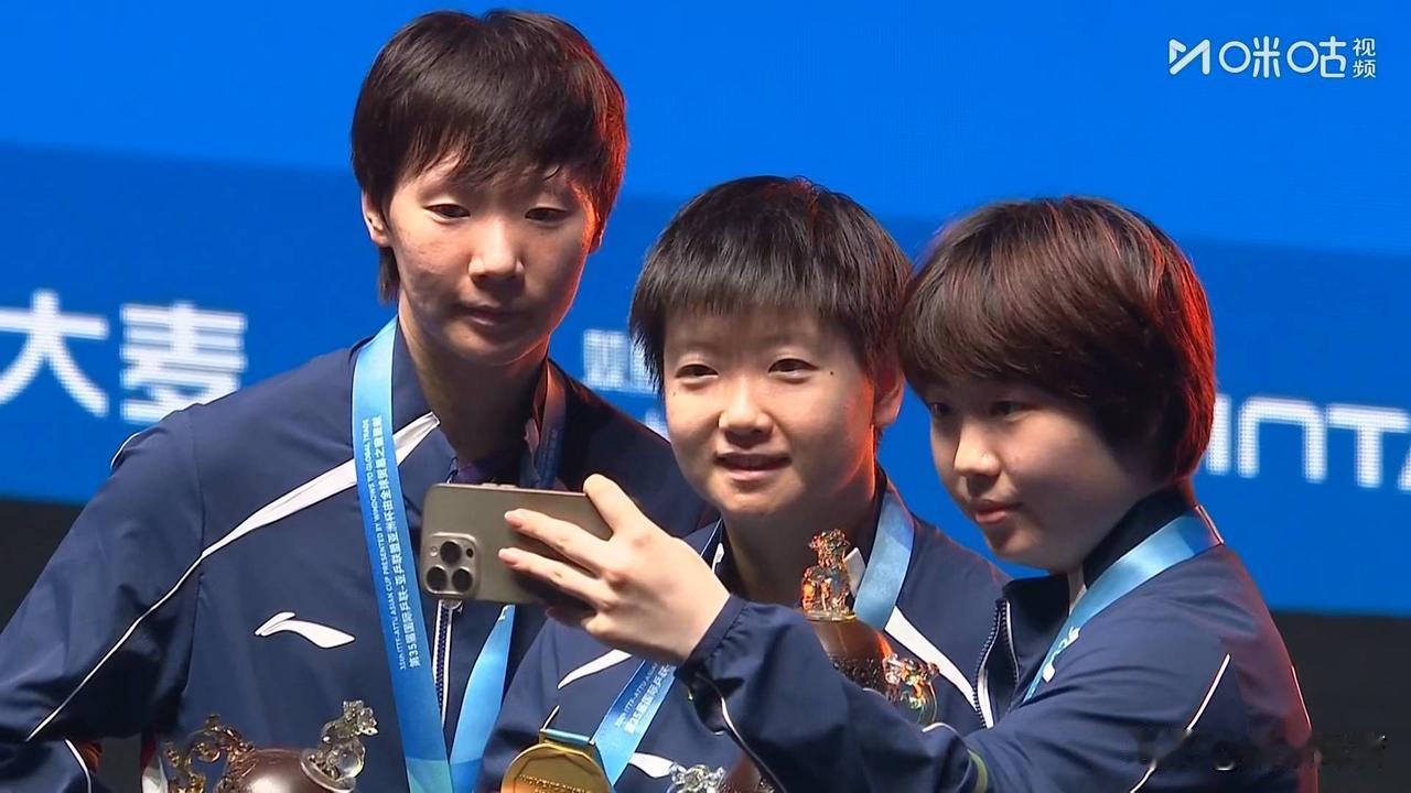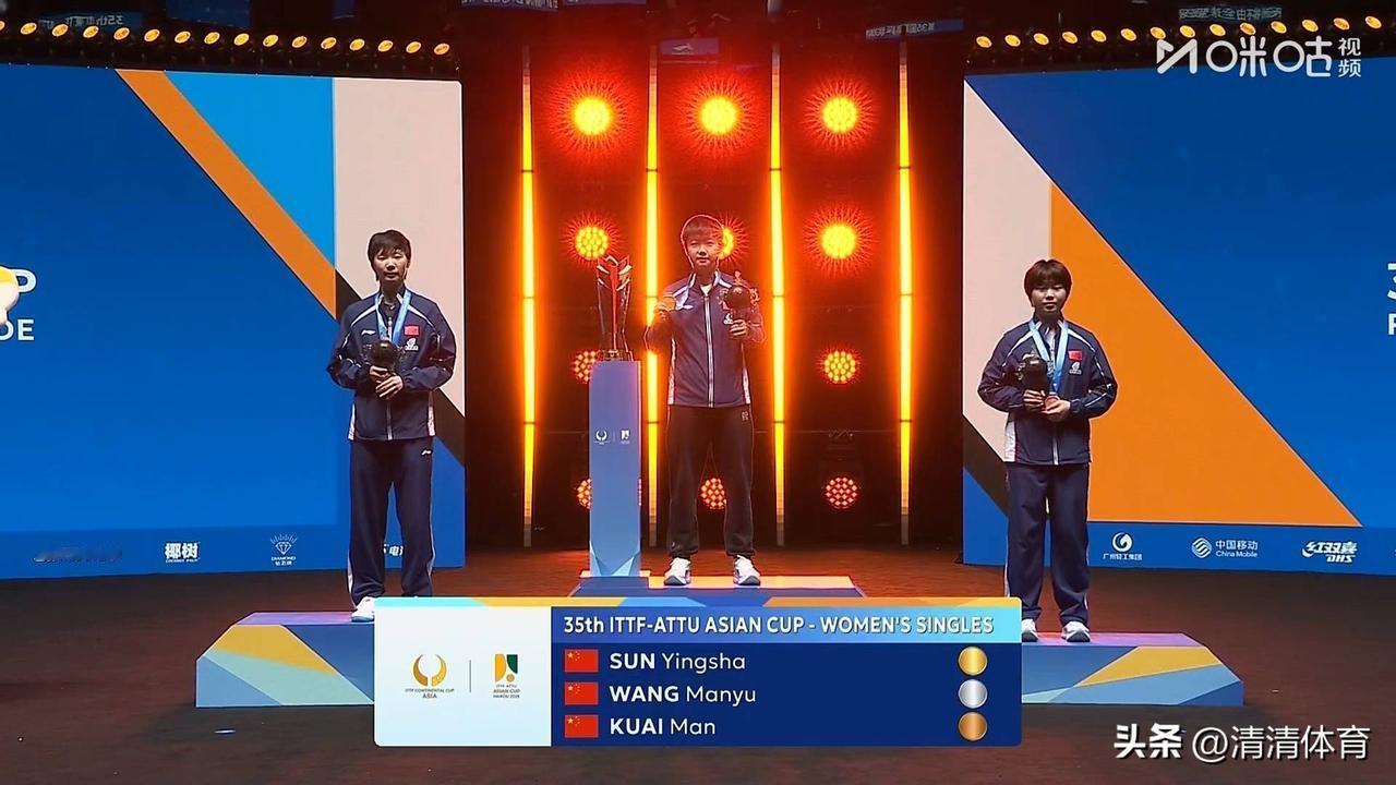 2026海口亚洲杯女单颁奖仪式,国乒三朵金花孙颖莎、王曼昱、蒯曼携手站上领奖台,三面五星红旗一同升起!金牌、银牌、铜牌尽数包揽,她们并肩合影,笑容自信耀眼。这是属于中国乒乓的荣耀时刻,是实力、拼搏与传承的最好见证,为三位姑娘骄傲!