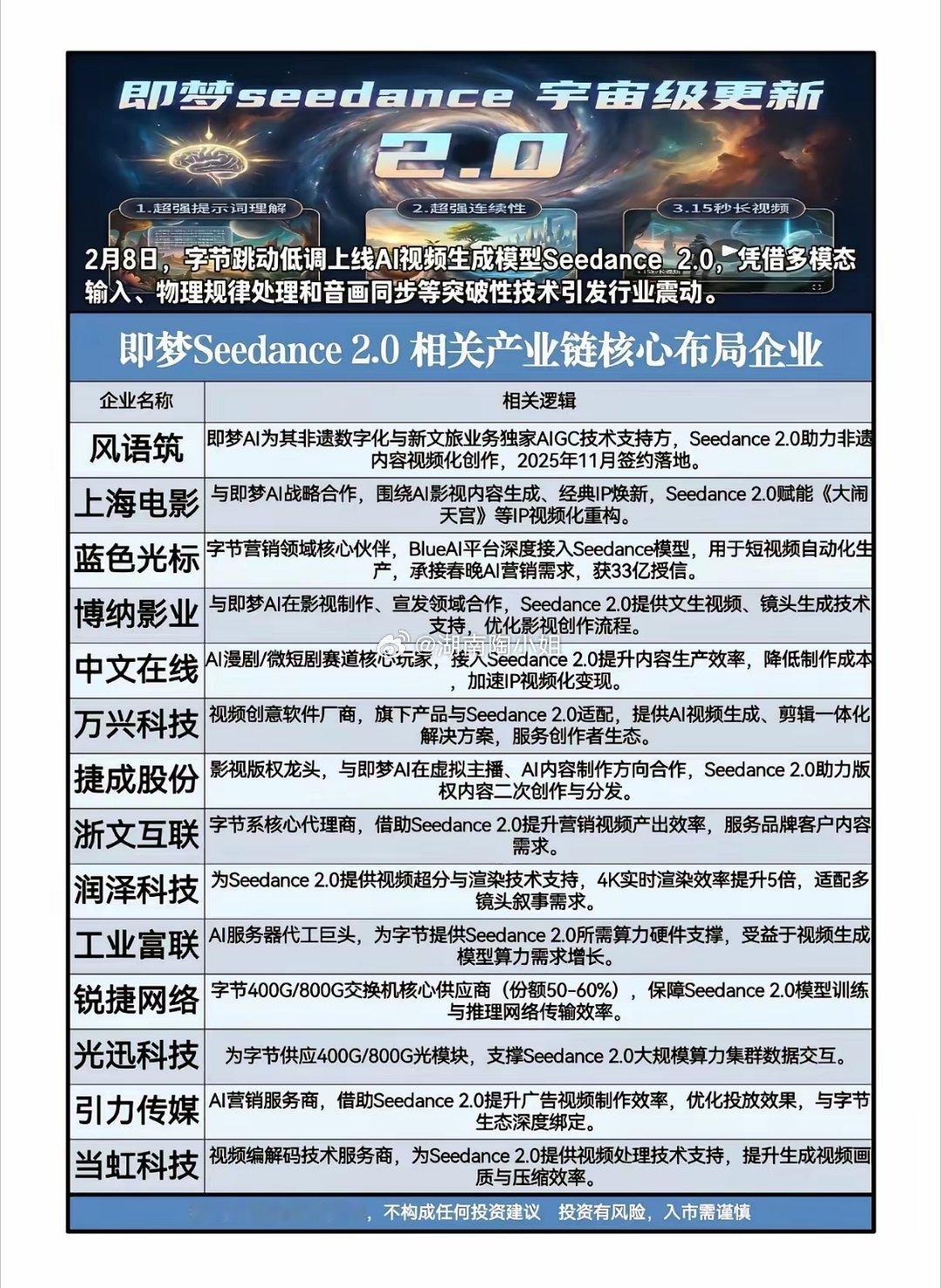 字节Seedance 2.0炸场!AI视频赛道真要“一飞冲天”?2月8日,字节跳动低调上线的Seedance 2.0,正以“宇宙级更新”的姿态,搅动整个AI视频生成赛道。凭借超强提示词理解、15秒长视频生成、物理规律处理和音画同步等突破性技术,它不仅重新定义了AI视频的创作边界,更让产业链上的核心玩家迎来了“黄金窗口期”。从图片中的产业链布局来看,从内容创作、技术适配到算力支撑,一条完整的商业闭环已经形成:内容端:风语筑、上海电影等公司借助Seedance 2.0加速非遗、影视IP的视频化重构,中文在线、博纳影业则在短剧、影视制作领域降本增效,让AI真正成为内容生产的“生产力工具”。技术端:万兴科技、当虹科技等厂商快速完成产品适配,提供从生成到剪辑、编解码的一体化方案,让普通创作者也能轻松驾驭专业级AI视频。 算力端:工业富联、锐捷网络、光迅科技等硬件巨头,为Seedance 2.0的大规模落地提供算力、网络和光模块支撑,直接受益于AI视频带来的算力需求爆发。放眼全球,OpenAI Sora、谷歌Lumiere等模型持续迭代,AI视频生成技术正从“能用”走向“好用”,而字节Seedance 2.0的落地,更是让国内产业链率先拿到了商业化的“入场券”。无论是品牌营销、影视制作还是短视频创作,AI视频都在以肉眼可见的速度渗透,行业增长的确定性极强。但在这场狂欢中,风险也不容忽视。部分标的因概念炒作短期涨幅过大,估值已严重透支业绩预期。一旦后续商业化进度不及预期,或技术迭代被竞争对手赶超,股价可能面临剧烈回调。Seedance 2.0的出现,无疑是AI视频赛道的“关键一跃”。它不仅证明了中国在多模态AI领域的硬核实力,更让整个产业链看到了从技术突破到商业变现的清晰路径。对于投资者而言,在拥抱“一飞冲天”的行业机遇时,更要警惕“泡沫化”的风险,唯有真正具备核心技术、深度绑定字节生态的企业,才能在这场AI视频革命中走得更远。⚠️ 风险提示:文中数据仅为市场公开信息整理,不构成任何投资建议。市场有风险,投资需谨慎。